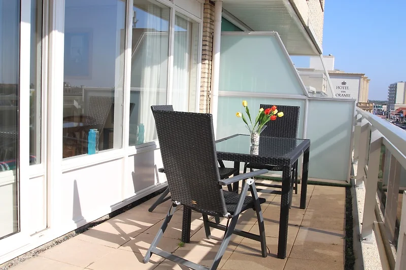 Op het grote balkon kunt u voor het ontbijt genieten van de ochtendzon en het uitzicht over de daken van Noordwijk aan Zee.