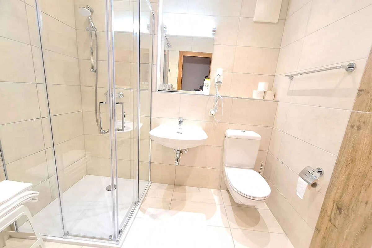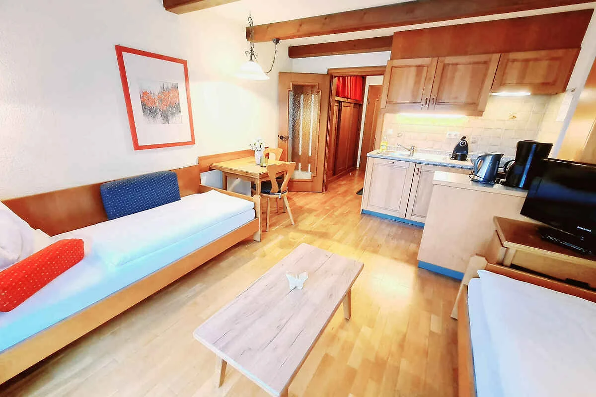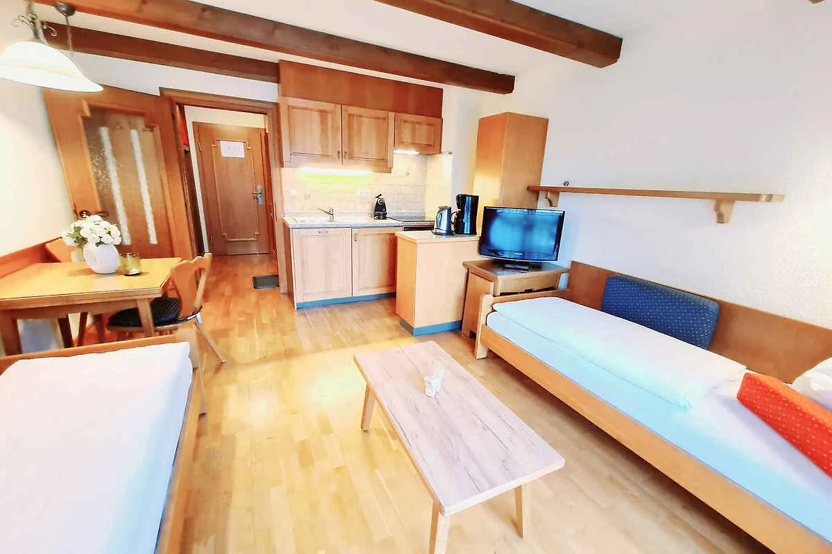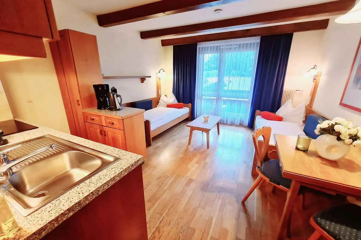 Uw vakantiewoning: Uw vakantiewoning beslaat 1 verdieping, 2 kamers (daarvan 1 slaapkamer), is 50 m² groot en is geschikt voor maximaal 5 personen. Op koude dagen kan uw vakantiewoning verwarmd worden. Roken is binnen niet toegestaan. De indeling van de kamers is als volgt: woon/slaapkamer met 2 extra bedden op slaapbank, TV en Kinderbed als overbevolking mogelijk: nee. U heeft toegang tot het balkon. slaapkamer met 1 tweepersoonsbed, 1 extra bed op slaapbank en 1 ledikant en Kinderbedje mogelijk wegens overbevolking: Nee, babybedje optioneel tegen betaling. Kooknis met afwasmachine, koelkast, magnetron, koffiemachine, elektrische waterkoker en Gas- of elektrisch fornuis, basis keukenapparatuur. vestibule badkamer met WC, haardroger en Bad met douchegelegenheid of douche.