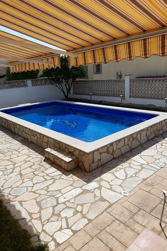 Op het perceel van ongeveer 550 vierkante meter, een vrijstaand huis met aantrekkelijke buitenruimte en een zwembad (8 mx 4 m) met aangrenzend terras. Het huis heeft 2 slaapkamers (elke kamer heeft 2 bedden), een woonkamer met satelliet-tv, eetkamer, keuken, volledig uitgeruste keuken, een grote en een kleine badkamer, elk met een toegankelijke douche en toilet. Een andere zonne-douche bevindt zich in de buitenruimte. Het terras is voorzien van tuinmeubilair, wat leidt via een trap naar het zwembad. Twee parkeerplaatsen bevinden zich in de plot.