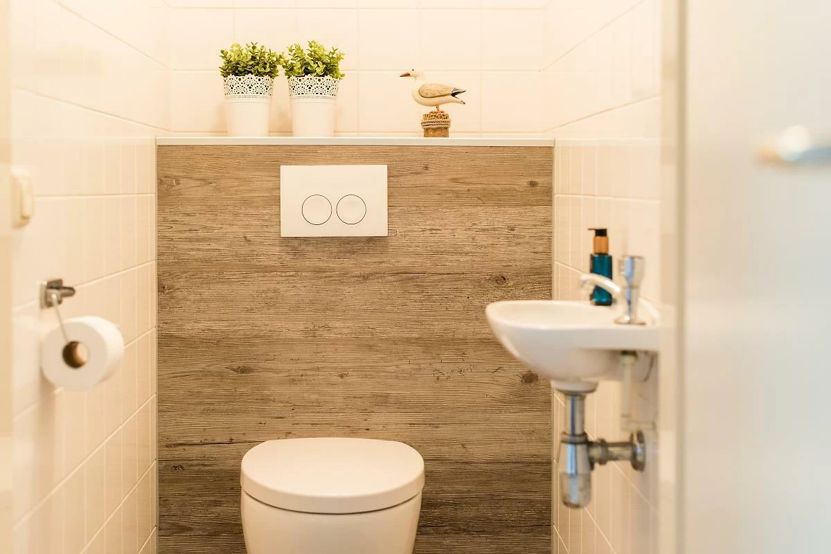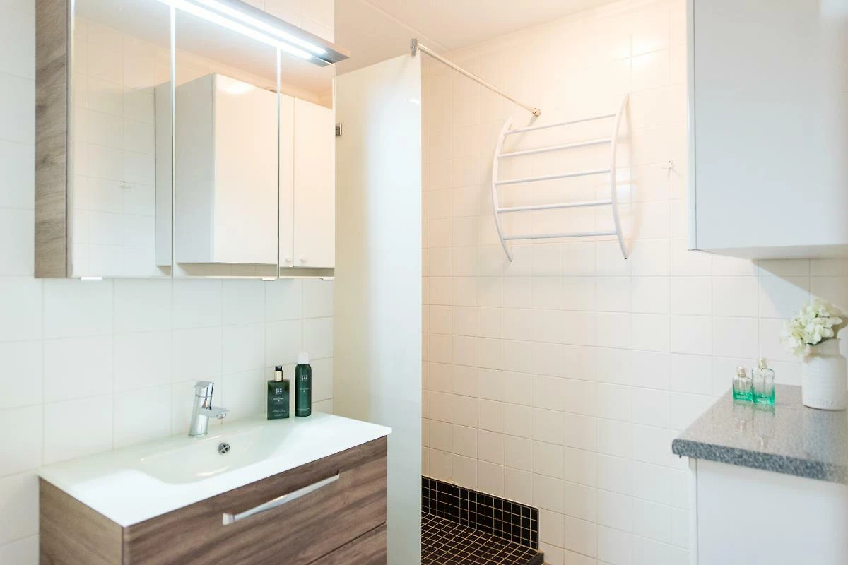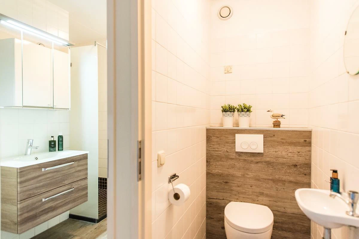 De ruime badkamer is voorzien van een grote douchecabine en wastafel. Daarnaast is er een separaat toilet aanwezig.