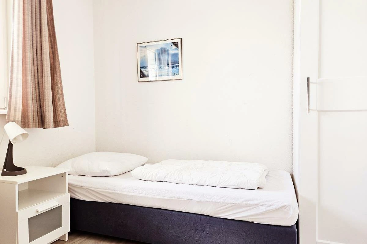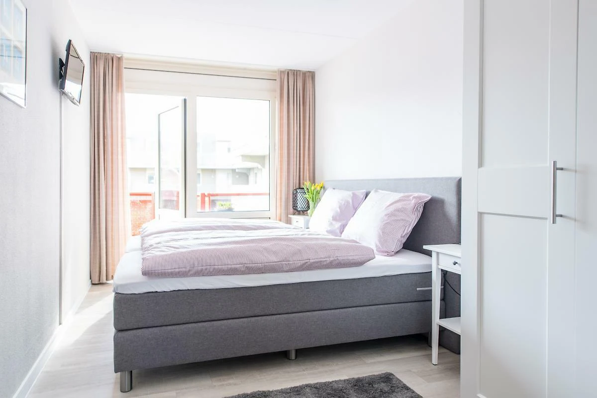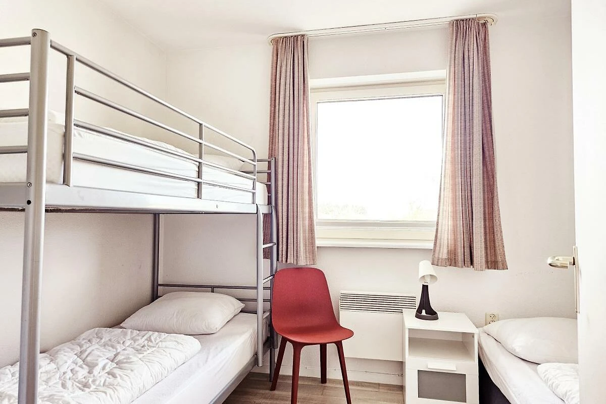 Vanuit de hal is er toegang tot de twee slaapkamers. De eerste slaapkamer heeft een royaal tweepersoons boxspringbed (1,80 x 2,00 m) televisie en een openslaande deur naar het balkon na de binnentuin. De tweede slaapkamer heeft een los eenpersoonsbed, een stapelbed.