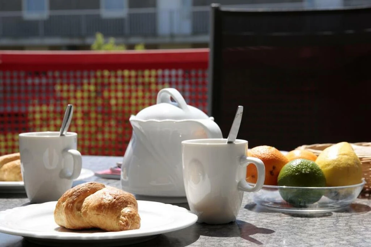 Het balkon is beschut tegen de wind en kijkt uit op de binnentuin. Hier kunt u vanaf de late ochtend rustig en zonder straatlawaai van de zon genieten. Een elektrische barbecue is beschikbaar.