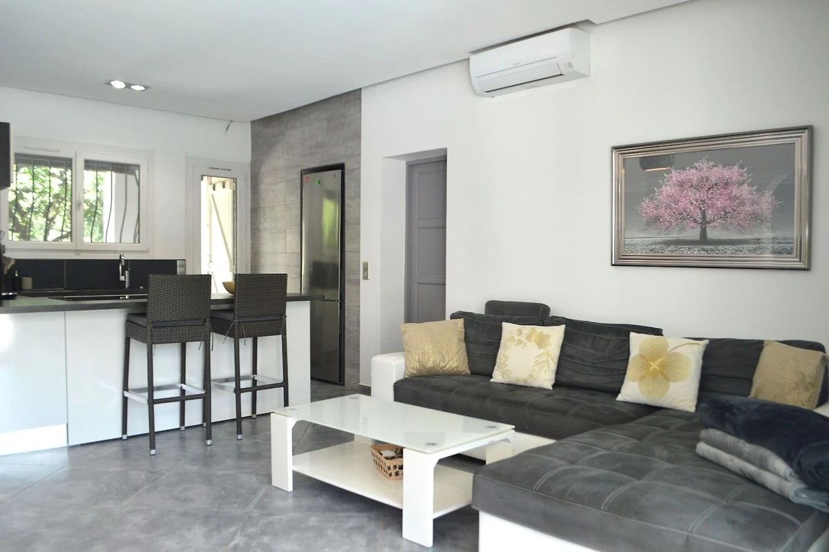De moderne woonkamer heeft een open ruimte met de keuken en schuifdeuren naar een overdekt terras, versterkt door kleurrijke muurschilderingen. Geniet van een comfortabele hoekbank met tv en een ronde tafel voor zes personen, plus een bar om gezelschap te houden tijdens het koken.