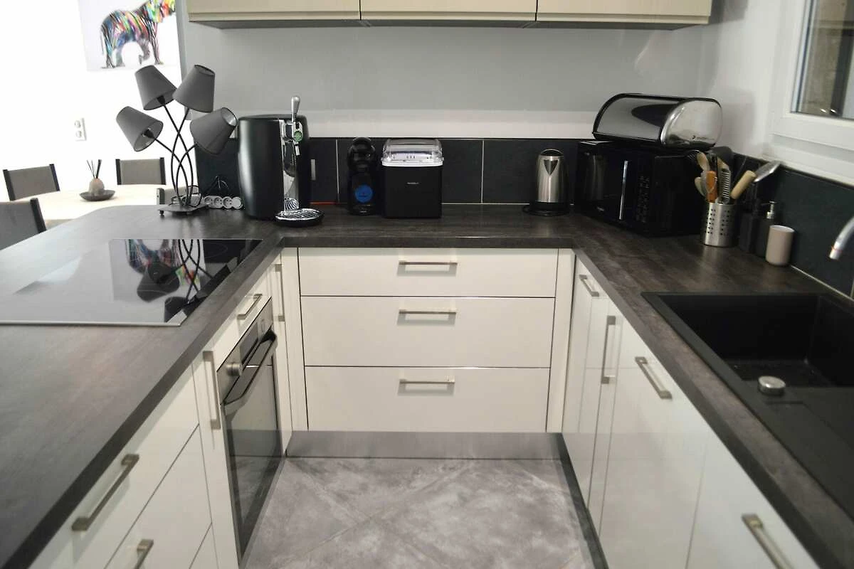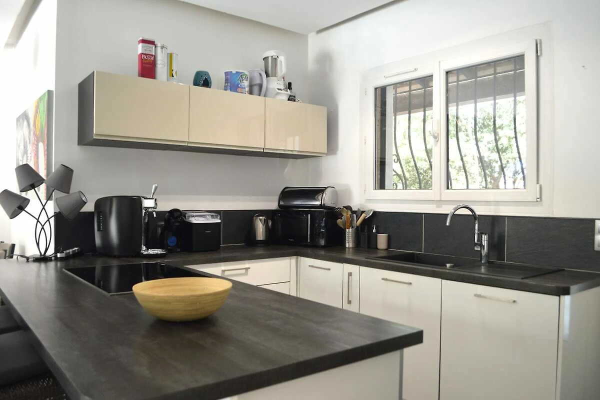 De keuken is volledig uitgerust met een koelkast, vriezer, magnetron, inductiekookplaat, vaatwasser en kleine apparaten, perfect voor het bereiden van maaltijden met lokale ingrediënten. Het opent ook naar een tweede terras aan de achterkant, compleet met tafels, stoelen en een plancha.
