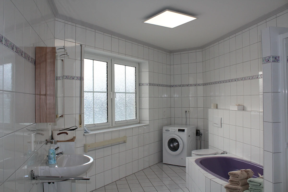 De badkamer is uitgerust met een douche, een bad, een toilet en een wasmachine.