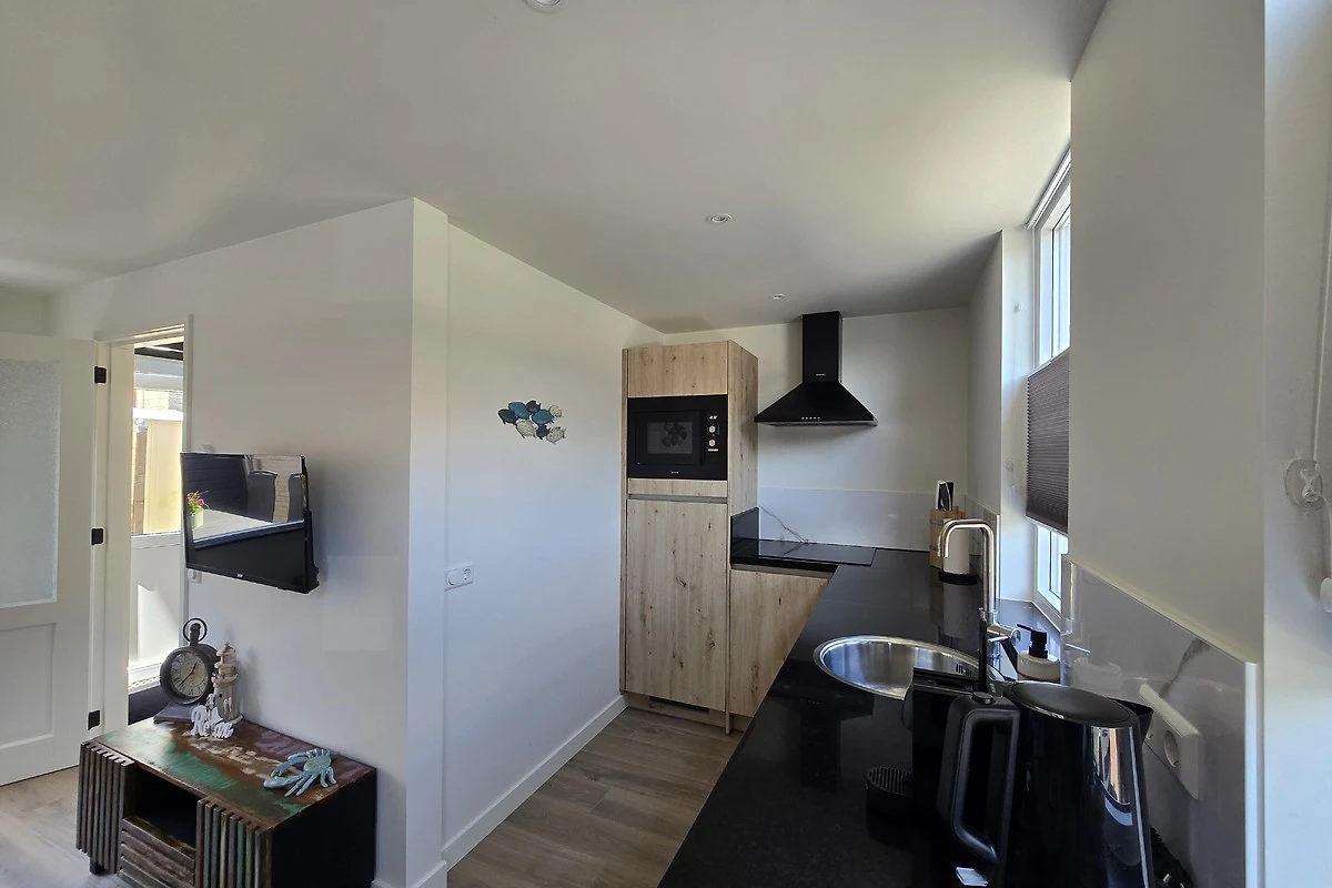 De woonkamer met volledig uitgeruste keuken en badkamer bevinden zich op de begane grond.
