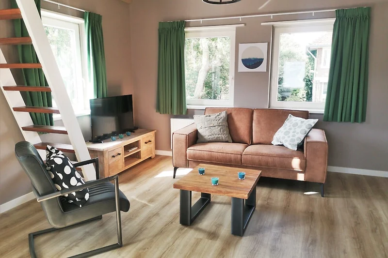 De open woonruimte omvat een gezellige zithoek met een televisie en een warm decor. De keuken is volledig uitgerust en biedt alles wat je nodig hebt, zoals een koffiezetapparaat, waterkoker, broodrooster, magnetron, oven, fornuis en vaatwasser. Hier vind je ook de eettafel waar je samen kunt genieten van maaltijden. De ruimte voelt licht en uitnodigend door de slimme indeling.
