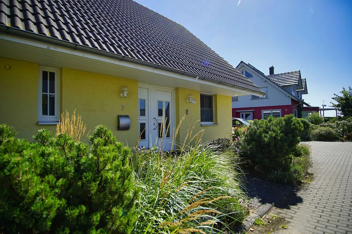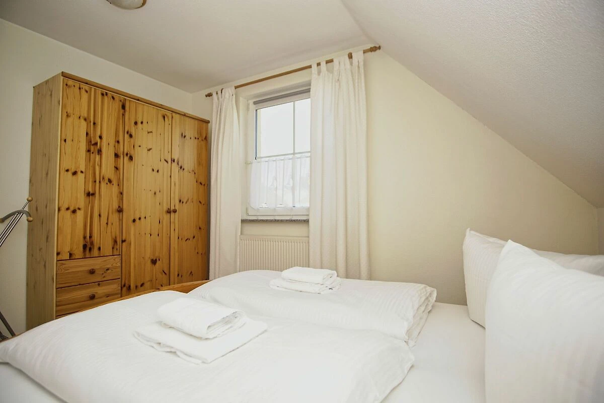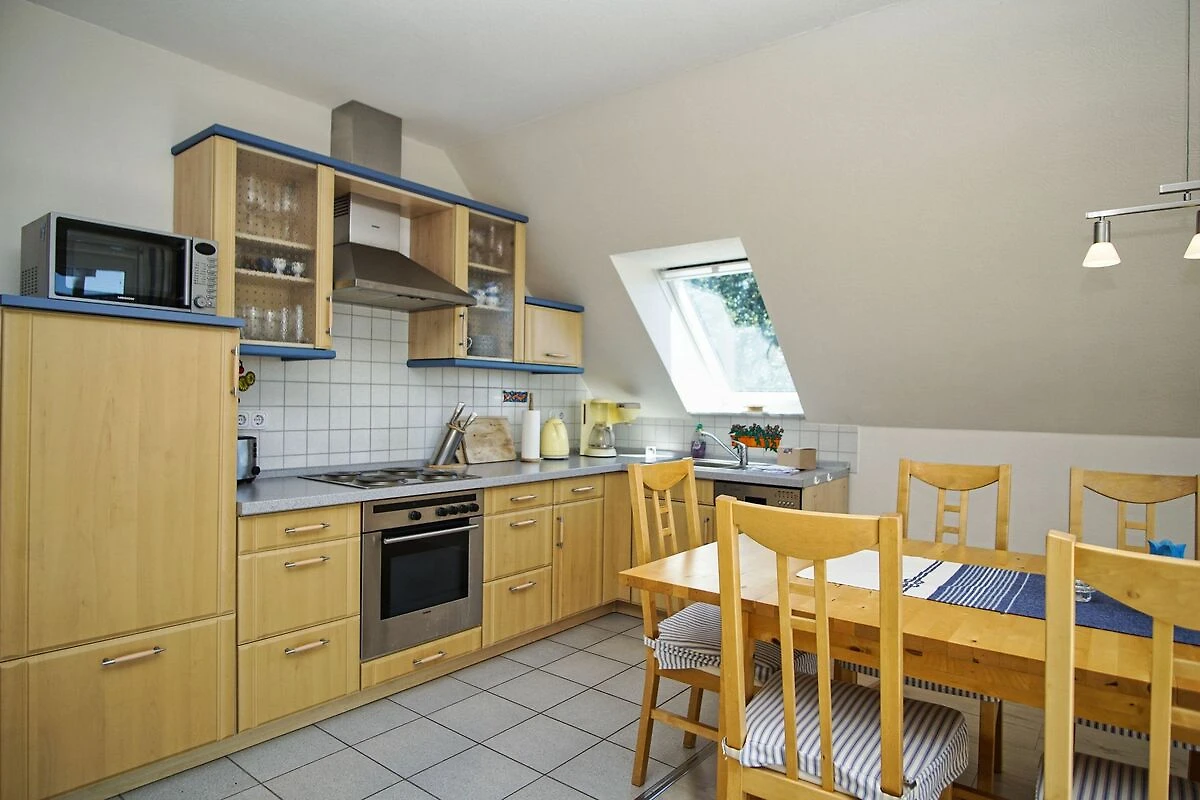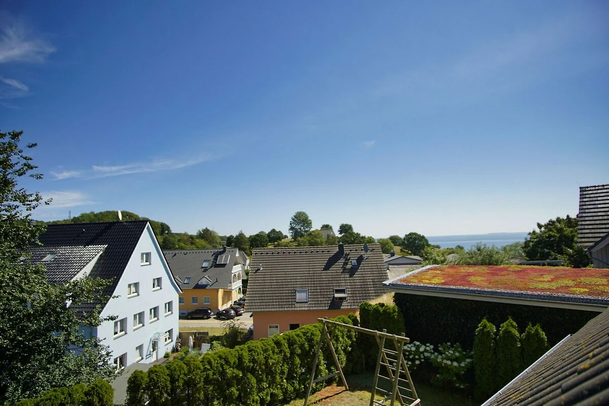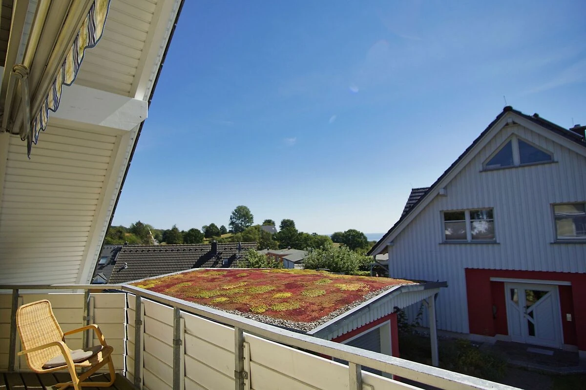 Zeer rustig gelegen (geen doorgaand verkeer) en toch slechts max. 500 m naar de "hoofdweg" (bakker, REWE-markt). Appartement licht en ruim. Uitzicht op zee mogelijk tussen de tegenoverliggende huizen. Balkon heeft een luifel.