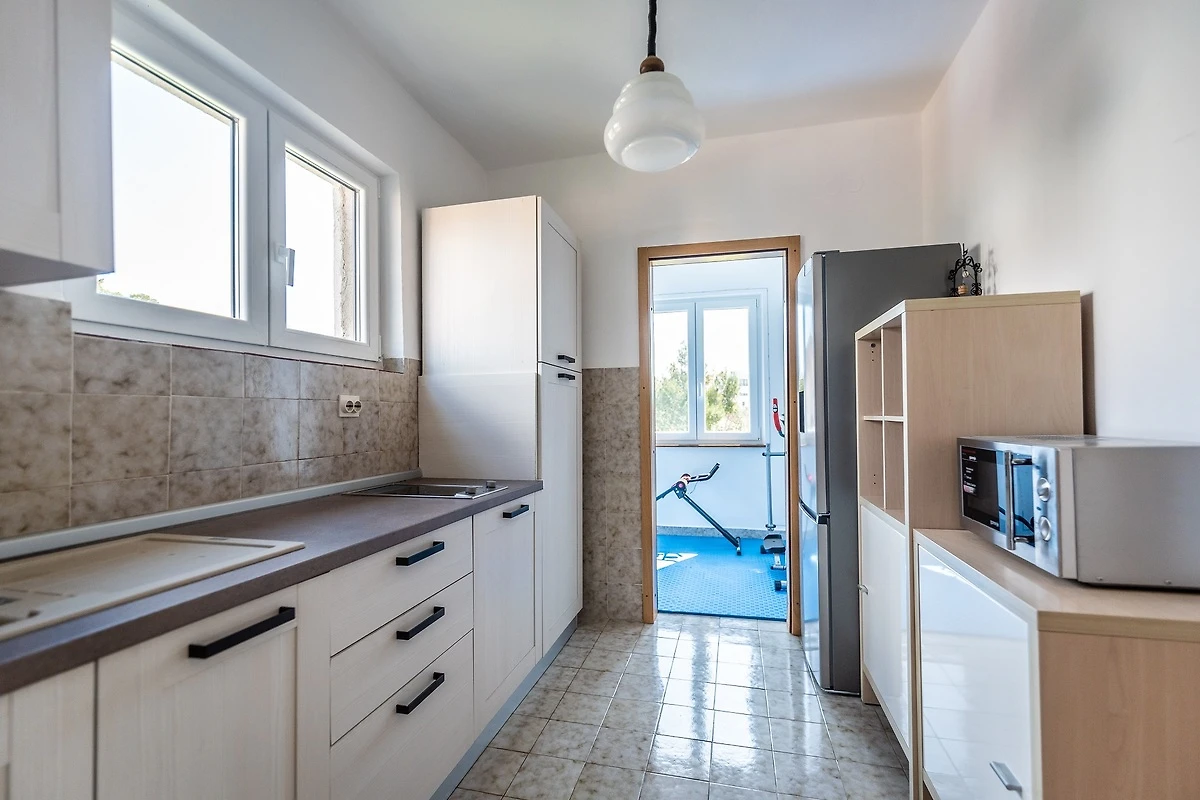 - Keuken (4 elektrische kookplaten, koelkast, filterkoffiezetapparaat, magnetron) verbonden met de woon- en eetkamer