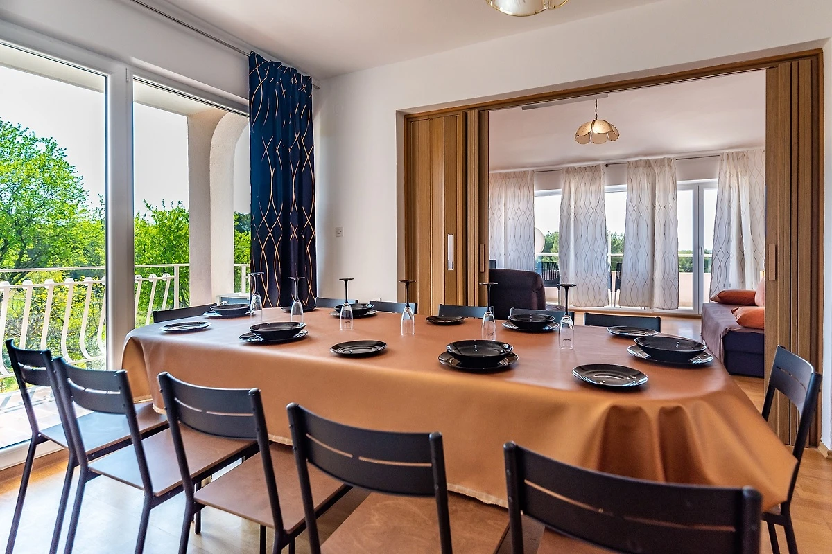 Villa Pula Bay bestaat uit 3 appartementen: één voor 6 personen, één voor 4 en één voor 2 personen, alle 3 samen gehuurd. Het biedt meer privacy dan een klassieke villa omdat het 3 keukens heeft met 3 eetkamers en woonkamers en 3 zithoeken in de tuin.