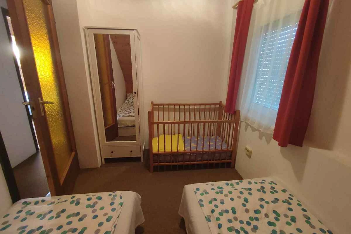 1.verdieping: slaapkamer met 2 éénpersoonsbedden. 2 slaapkamer elk met 2 éénpersoonsbedden. gang badkamer met badkuip, 1 wastafel, WC, haardroger en venster.