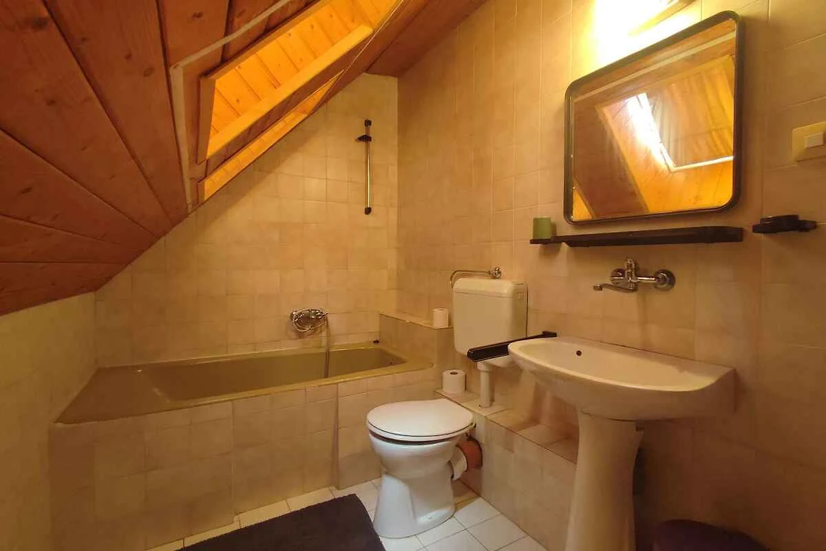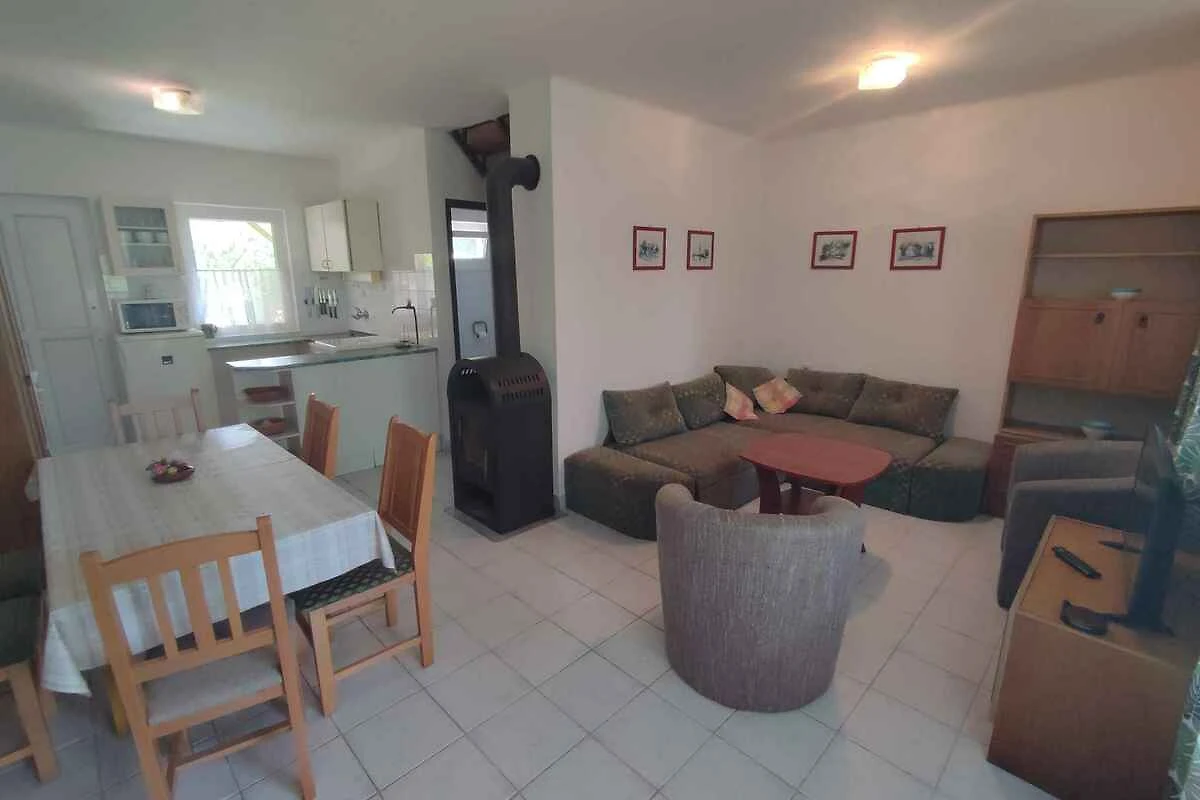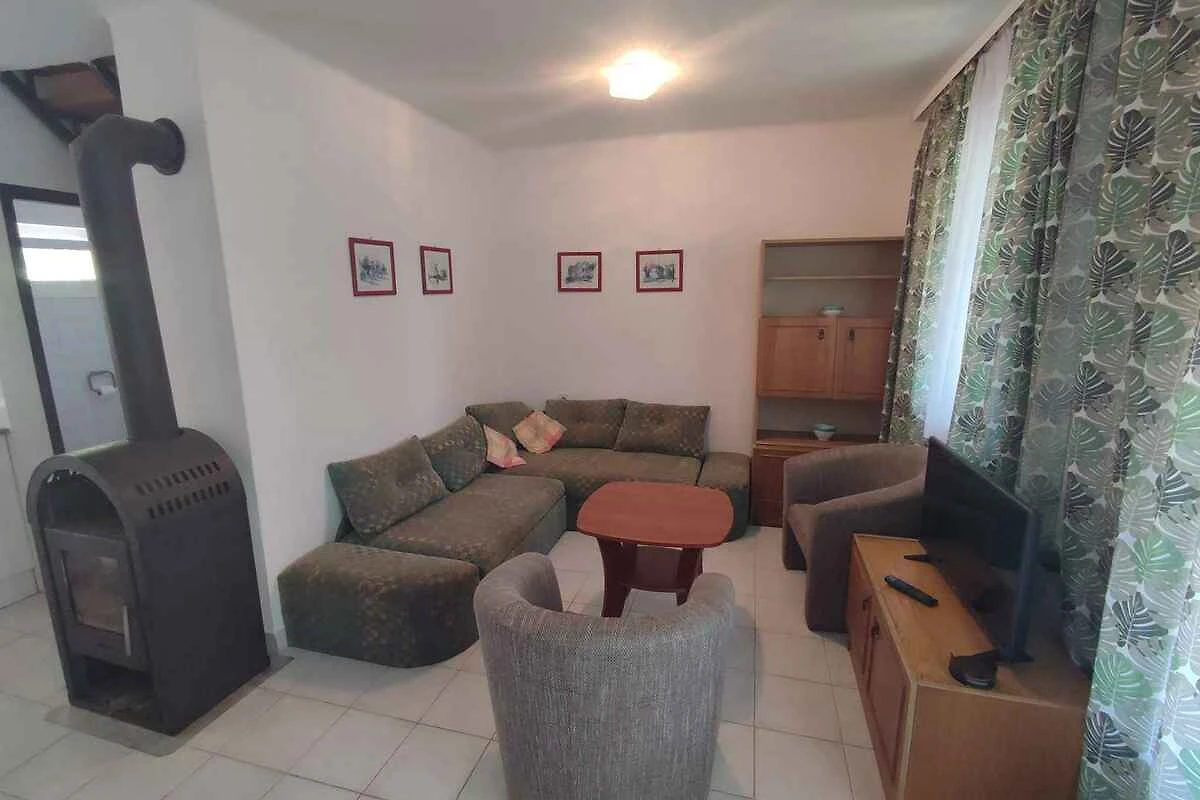 begane grond: woonkamer 25 m² groot en met zithoek, eethoek, TV en vaskályha. De eethoek heeft plaats voor 6 personen. U heeft toegang tot het 18 m² grote, overdekt terras met tuinmeubelen, 1 tafel en 6 stoelen. kookhoek in de woonkamer met gasfornuis (4 pitten), bakoven, magnetron, koffiemachine en elektrische waterkoker. badkamer met douche, 1 wastafel, WC en venster.