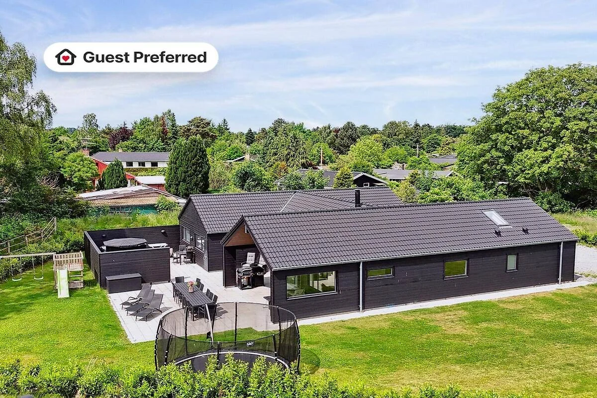 Luxuriöses Pool-Cottage mit Innen- und Außenwhirlpools sowie Außensauna.Dieses luxuriöse Ferienhaus liegt in der wunderschönen Gegend bei Hornbæk. Hier haben Sie reichlich Gelegenheit, die Natur Nordseelands mit dem Fahrrad oder zu Fuß zu erkunden. Das Ferienhaus liegt in der Nähe des langen, kinderfreundlichen Sandstrands in der Dronningmøllebucht.In diesem Ferienhaus können Sie sich in luxuriöser Umgebung jeden Wunsch nach Wellness und Entspannung erfüllen. Hier haben Sie Ihren ganz persönlichen Wellnessbereich. Genießen Sie ruhige Momente unter freiem Himmel im Außenwhirlpool oder wärmen Sie sich in der Außensauna auf. Wenn Sie es etwas aktiver mögen, können Sie im Innenpool mit Rutsche und Volleyballnetz schwimmen. Neben dem Pool befindet sich ein weiterer Whirlpool mit Platz für 7–9 Personen.Nach einem schönen Bad können Sie sich im Aktivitätsraum des Hauses zu einer Partie Billard, Tischtennis, Tischfußball oder Darts herausfordern. Sie können auch bei einem guten Film vor dem Fernseher entspannen oder auf der hauseigenen PlayStation spielen. Hier gibt es jede Menge Aktivitäten, und jeder Gast findet garantiert seine Lieblingsbeschäftigung.Der große, helle Wohn-/Essbereich ist der ideale Treffpunkt. In der gut ausgestatteten Küche können Sie für alle kochen. Am Esstisch finden Sie außerdem Platz für gemeinsame Mahlzeiten oder eine Runde Brettspiele.Der Holzofen sorgt sowohl im Essbereich als auch im Wohnzimmer für wohlige Wärme. Im Wohnzimmer können Sie vor dem Fernseher entspannen und durch die großen Fenster, die für viel Licht sorgen, den Blick in den Garten genießen.Das Haus verfügt über fünf Zimmer, aufgeteilt in zwei Schlafbereiche. Außerdem gibt es vier Schlafplätze auf dem Dachboden. Die Schlafplätze auf dem Dachboden eignen sich besonders gut für Kinder. Insgesamt bietet das Ferienhaus Platz für 14 Gäste.Im Freien bietet die große, teilweise überdachte Terrasse zahlreiche Möglichkeiten, den Sommer zu genießen. Sie können den Grill anwerfen und leckere Mahlzeiten im Freien genießen, während die Kinder im Garten, auf dem Trampolin oder im Spielturm spielen.In diesem herrlichen Cottage gibt es jede Menge Aktivitäten und es bietet den perfekten Rahmen für einen fantastischen Urlaub.
