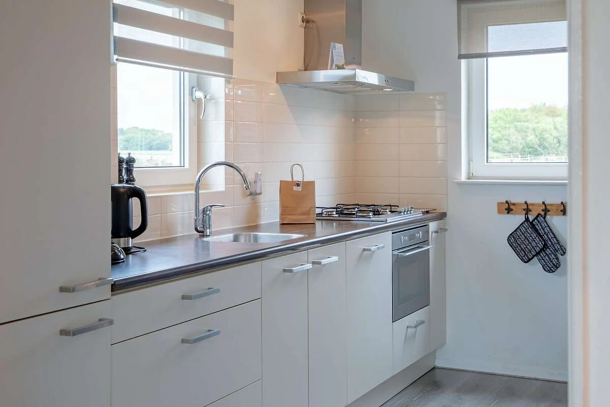 Vanuit de ruime entree kom je via een gezellige schuifdeur in de woonkamer. Aansluitend vind je de keuken, die voorzien is van moderne apparatuur om je verblijf zo aangenaam mogelijk te maken. Op de eerste verdieping bevinden zich 2 ruime slaapkamers met heerlijke grote bedden en een moderne badkamer met een ruime inloop regendouche en een heerlijk ligbad.