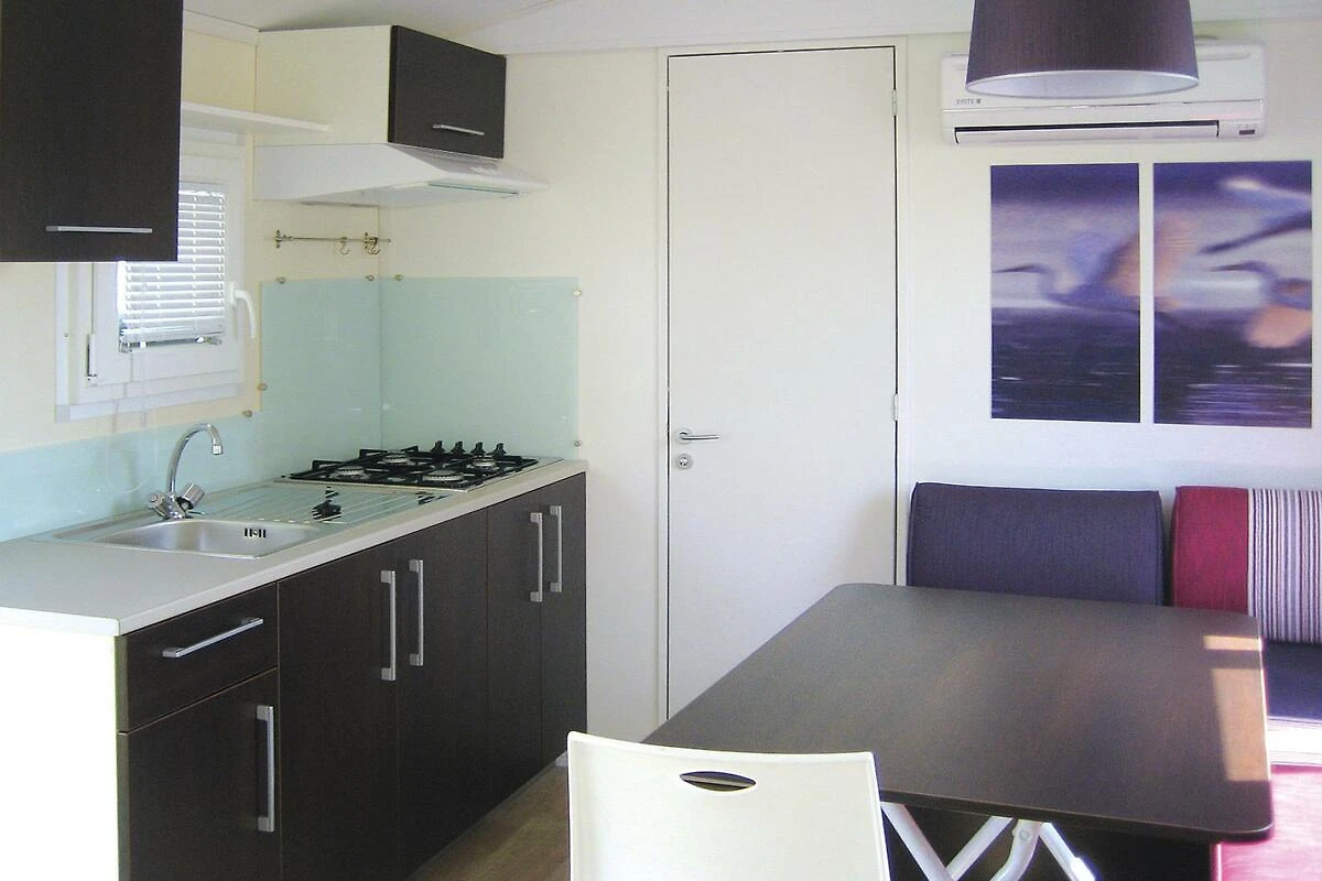 Woonkamer(2-pers. slaapbank, TV(satelliet), airconditioning), kitchenette(eettafel, kookplaat(4 kookplaten), koelkast), slaapkamer(2-pers. bed), badkamer(douche, toilet), garage, Receptie, Winkel, Minimarket, Tennisbaan, Tafeltennis, Voetbalveld, Restaurant, Bar, Kinderclub, grill, wasdroger, wasmachine(gedeeld met andere gasten, tegen betaling), verwarming, terras, BBQ, parking, zwembad(gedeeld met andere gasten, buiten, inclusief separaat peuterzwembad (diepte 50cm), 20 x 10 m.), baby crib(paid)