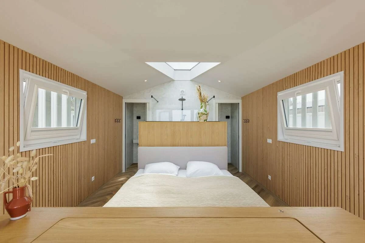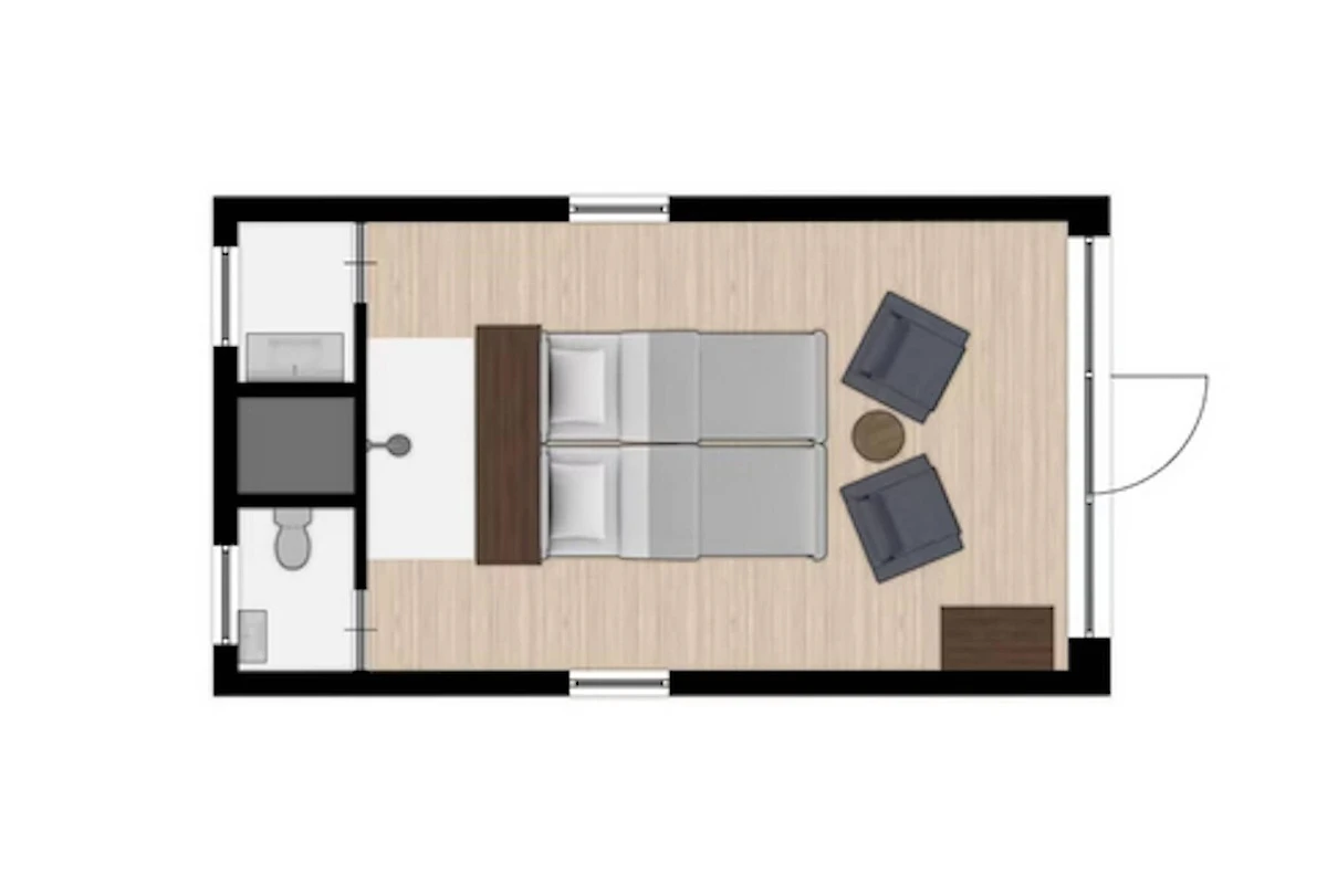 De strandstudio op de begane grond is modern en stijlvol ingericht. De woon-/slaapkamer is voorzien van een tweepersoonsbed, een zithoek, een koelkast, een koffiezetapparaat en een waterkoker. De inloopdouche bevindt zich direct achter het bed. Het toilet bevindt zich achter een deur. Voor extra comfort in de warme maanden is er airconditioning aanwezig. Deze kunt u op koudere dagen ook als verwarming gebruiken.