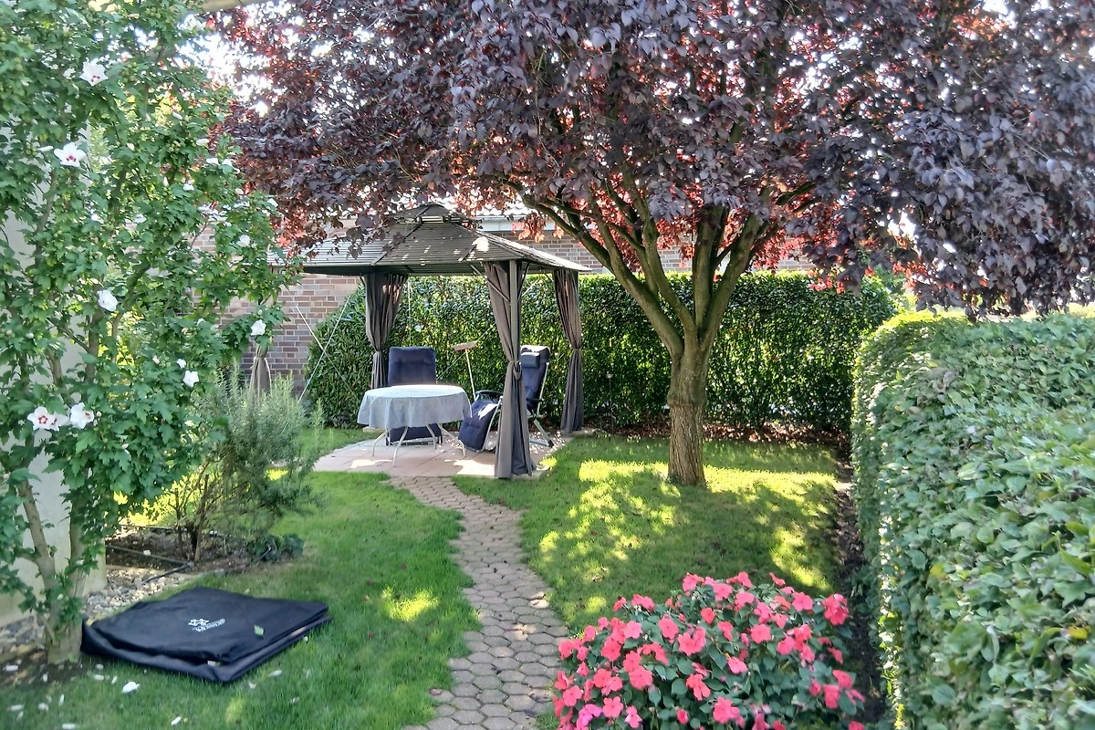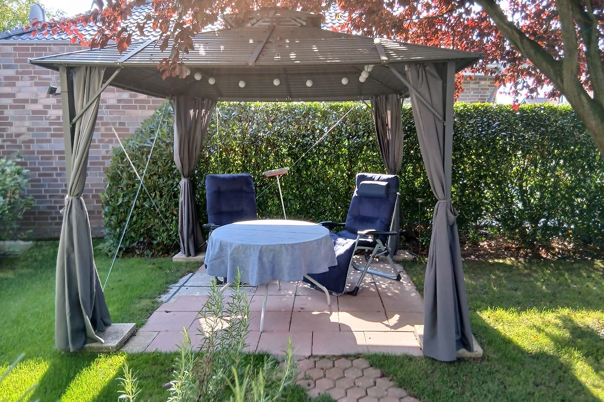 Voor de gasten is een afgezet stuk tuin met een gezellig prieeltje aanwezig. De tuin wordt prima verzorgd door Uwe.