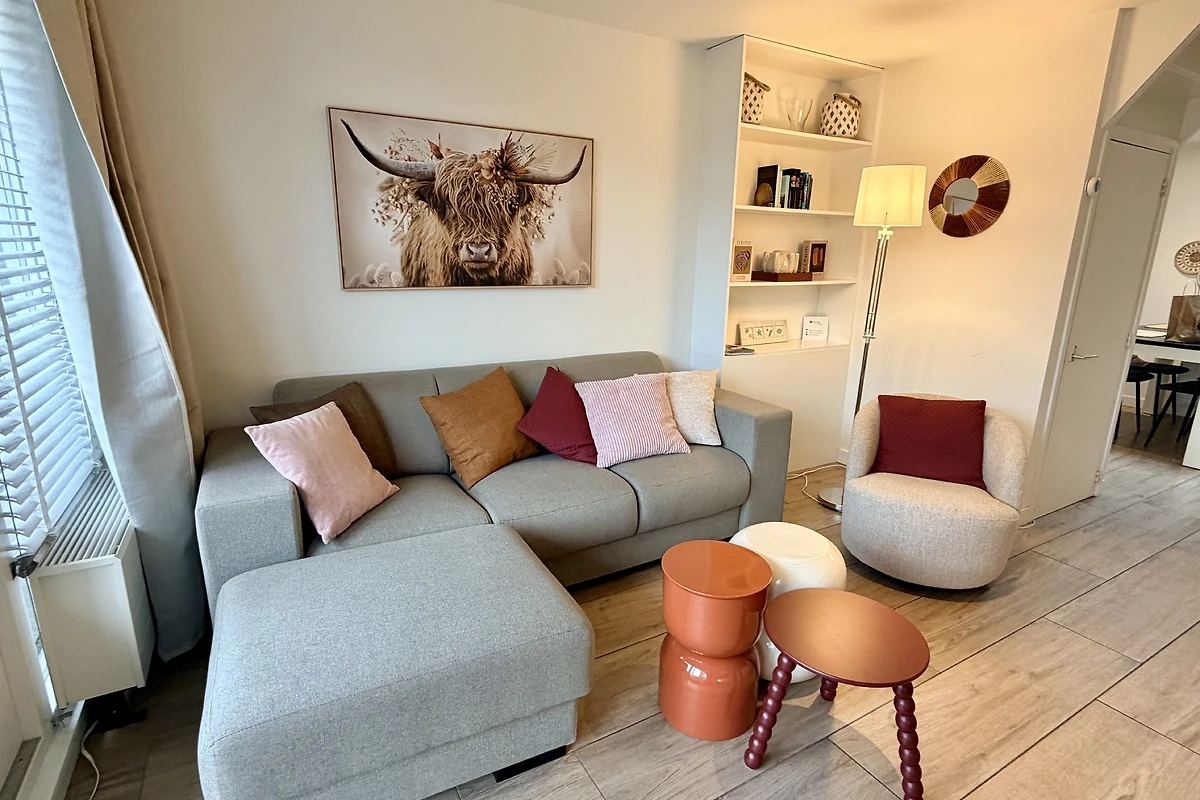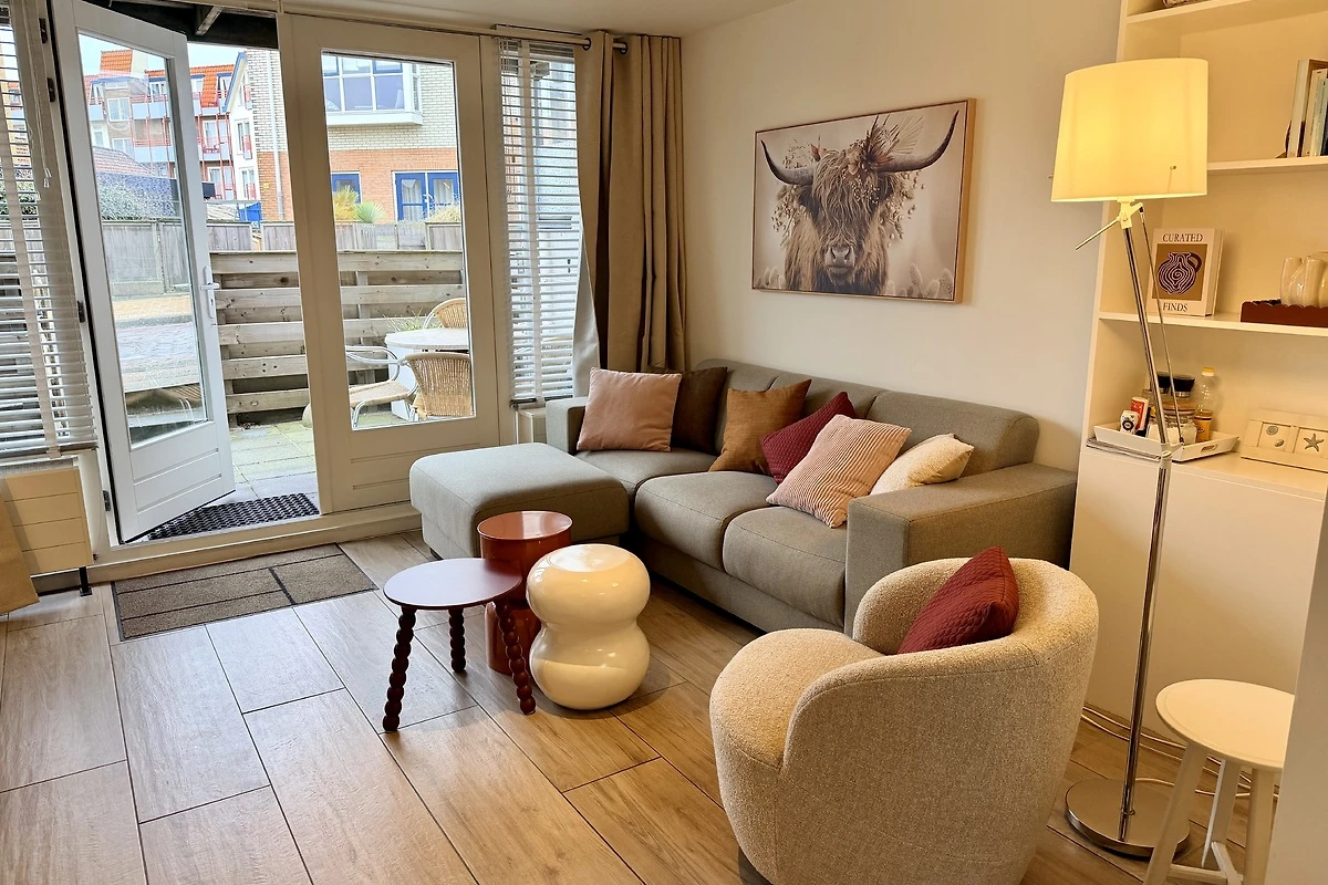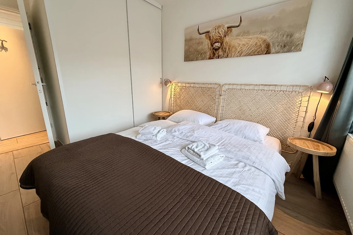 Slechts 200 meter van het strand verwijderd! Smaakvol en modern ingericht vakantieappartement bijna aan het strand. Vanaf uw eigen, op het zuidwesten gelegen terras komt u in een woonkamer met tv en zithoek, een goed uitgeruste keuken met vaatwasser en oven/magnetron. Via een wat steile trap bereikt u de 1e verdieping. Via een wat steile trap bereikt u de twee slaapkamers en de badkamer. De kleine badkamer is uitgerust met een douche en een wastafel. Het toilet bevindt zich op de begane grond.
