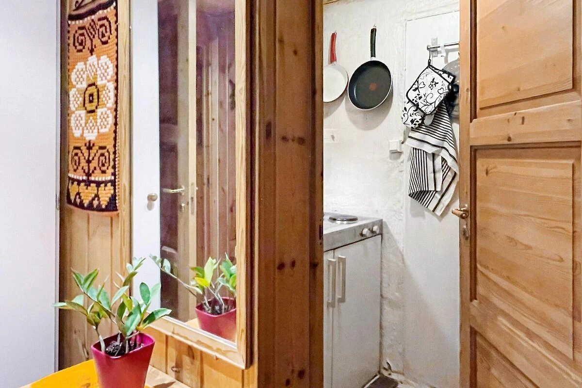 , woonkamer(2x 1-pers. vouwbed, TV), keuken(fornuis(2 kookplaten), koffiezetapparaat, magnetron, koelkast(+ vriesvak)), slaapkamer(2x 1-pers. bed), badkamer(wasbak, douche, toilet, wasmachine), verwarming(elektrisch)