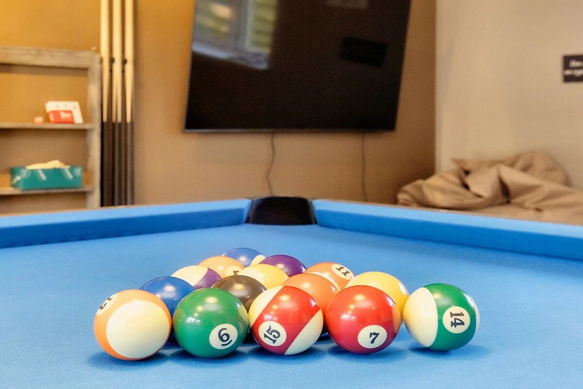 , keuken(kachel(inductie), koffiezetapparaat, oven, magnetron, afwasmachine, koelkast), woon/slaapkamer(TV, spelcomputer), slaapkamer(2-pers. bed, 2x stapelbed), slaapkamer(2x 1-pers. bed), slaapkamer(2x 1-pers. bed), badkamer(ligbad, wasbak, douche, toilet), badkamer(wasbak, douche, toilet), bijkeuken(koel-/vriescombinatie, wasdroger, wasmachine), bubbelbad(buiten, verwarmd, 7 personen), sauna(buiten, 8 personen), dart, biljart, lucht-water warmtepomp