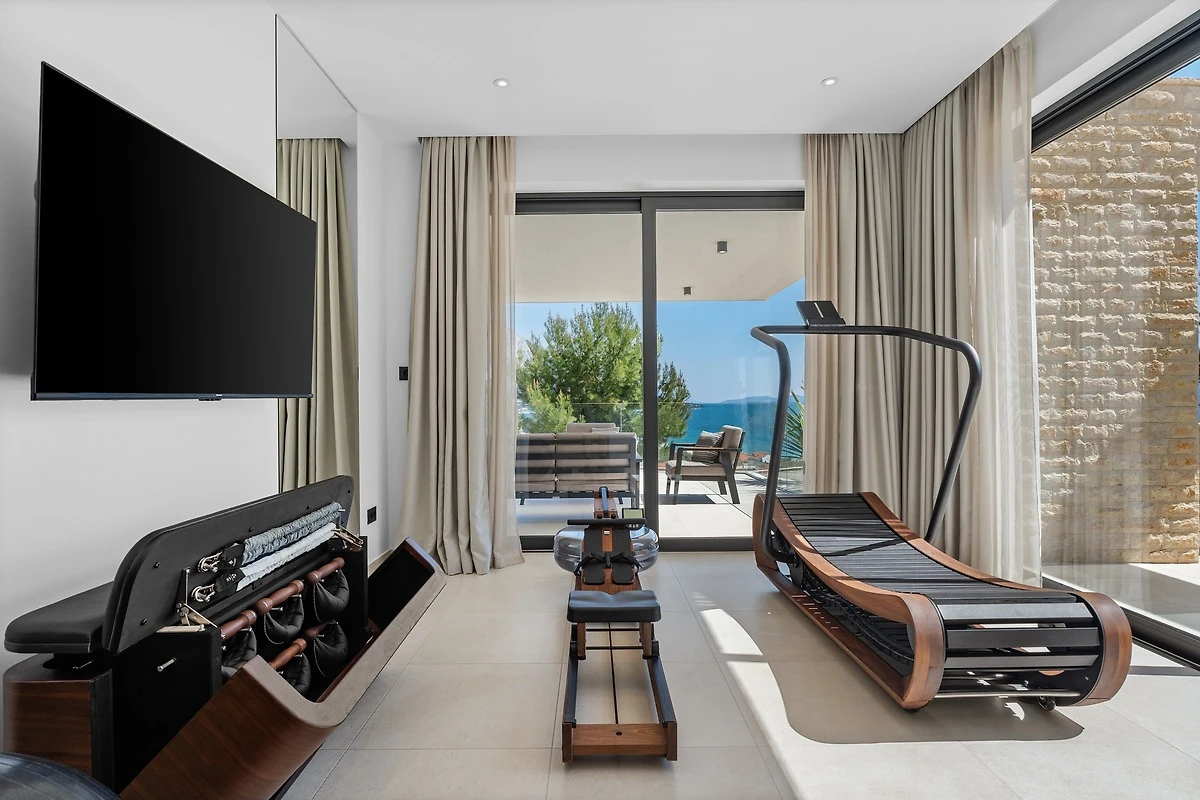 *Het buitengebied (op de begane grond) biedt een privé, verwarmd zwembad van 28,5 m² (7m x 4,5m) met tegenstroomzwemprogramma en volledig geautomatiseerd zoutsysteem voor elektrolyse, 8 ligstoelen, een buitendouche, een overdekte en comfortabele loungehoek, allemaal met spectaculair uitzicht op de zee en de bergen. De schuifdeur brengt je naar de keuken op de begane grond met een volledig uitgeruste, elegante privé sportschool.* De ruimte is ontworpen om topfunctionaliteit te combineren met topdesign, en elk apparaat is zorgvuldig geselecteerd uit het assortiment van het gerenommeerde merk NOHrD, bekend om topkwaliteit vakmanschap, innovatie en het gebruik van natuurlijke materialen zoals walnoothout, tot aan de sauna en ook naar de mediaruimte. Vanuit het zwembadgedeelte kun je via de buitentrap naar de traditionele barbecuehoek voor je grillvaardigheden samen met de buiteneettafel (de deur ernaast is de hoofdkeuken op de eerste verdieping). Op de begane grond (zwembadniveau) is volledige airconditioning en gratis WiFi beschikbaar. Daar vindt u een volledig uitgeruste keuken met een eettafel voor 8 personen, een tv, airconditioning, en een schuifdeur naar het zwembadgedeelte. Er is een Mediaruimte met een flatscreentelevisie, PS5, Bose-soundbar, airconditioning, een bank (die kan worden omgebouwd tot slaapbank), en een schuifdeur naar het zwembadgedeelte . Er is ook een Finse sauna, een inloopdouche, en een apart toilet. De eerste verdieping biedt een zeer stijlvolle en comfortabele woonruimte met een flatscreen-tv, airconditioning, een elektrische stoomhaard, enkele zithoeken en spectaculair uitzicht op zee en de bergen waar je ook kijkt dankzij de ramen van glas tot aan het plafond. Een volledig uitgeruste keuken met een eettafel voor 8 personen en een kookeiland met barkrukken, de keuken is voorzien van alle voorzieningen die je nodig hebt voor een comfortabel verblijf (magnetron, capsule koffiezetapparaat Nespresso, een broodrooster, een waterkoker...). , directe toegang tot de eethoek buiten met de barbecue met uitzicht op de bergen en de zee. Een apart toilet.