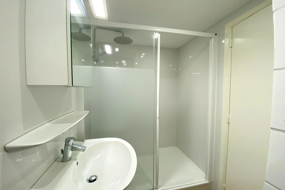 Op de 5e etage: (open keuken(kookplaat(elektrisch), afzuigkap, koffiezetapparaat, combimagnetron, afwasmachine, koelkast), woon/eetkamer(TV(digital), eettafel, zithoek, balkon of terras), slaapkamer(2-pers. bed(2 persoons dekbed, 140 x 200 cm)), slaapkamer(stapelbed(dekbed), stapelbed(dekbed)), badkamer(douche, wastafel), toilet(toilet), berging(strijkplank, strijkijzer))
