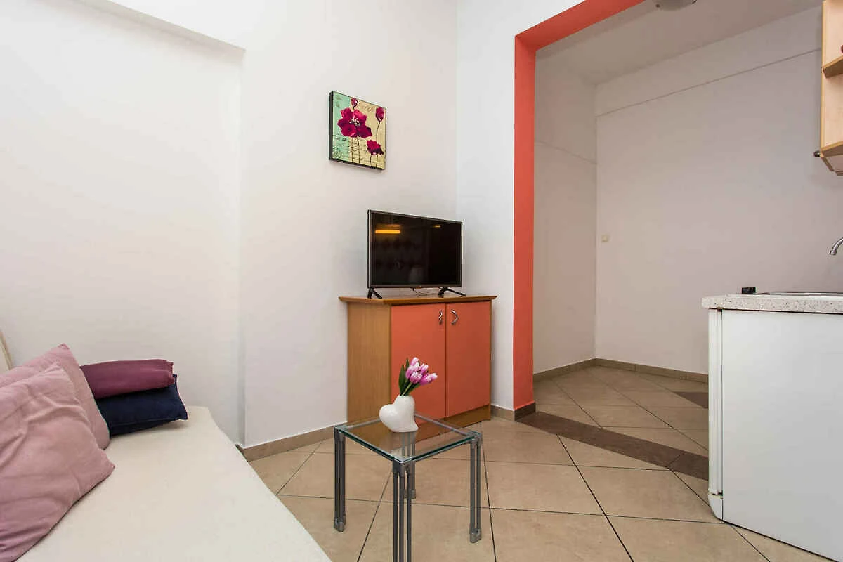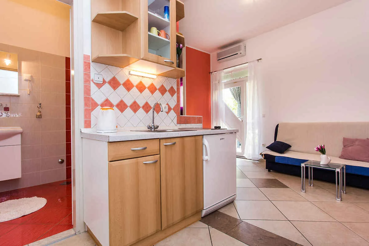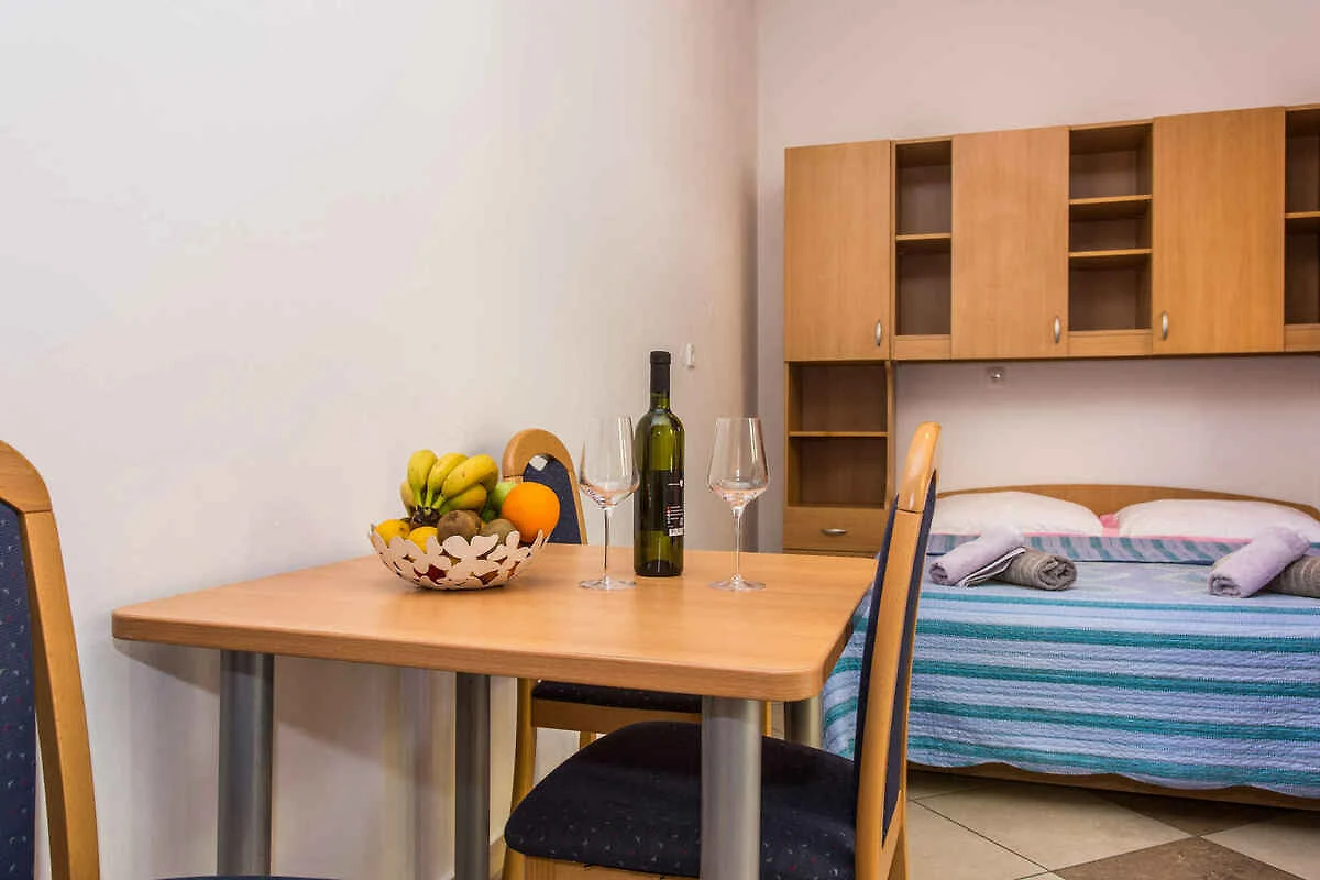 Ligging: Baška. De studio ligt in een appartementenhuis en is in lokale stijl ingericht. Het grondstuk is aan de rand van de plaats. Deze plaats is populair vanwege het ligt op een rustige plek. Uitzicht op het erf Bij het huis zijn parkeerplaatsen op het perceel beschikbaar. De dichtsbijzijnde winkels zijn op 50 m afstand, restaurant 50 m en centrum 50 m. Baska: discotheek 150 m en dokter, apotheek, bank elk 50 m. vliegveld in Rijeka 40 km.