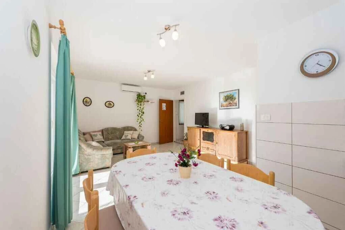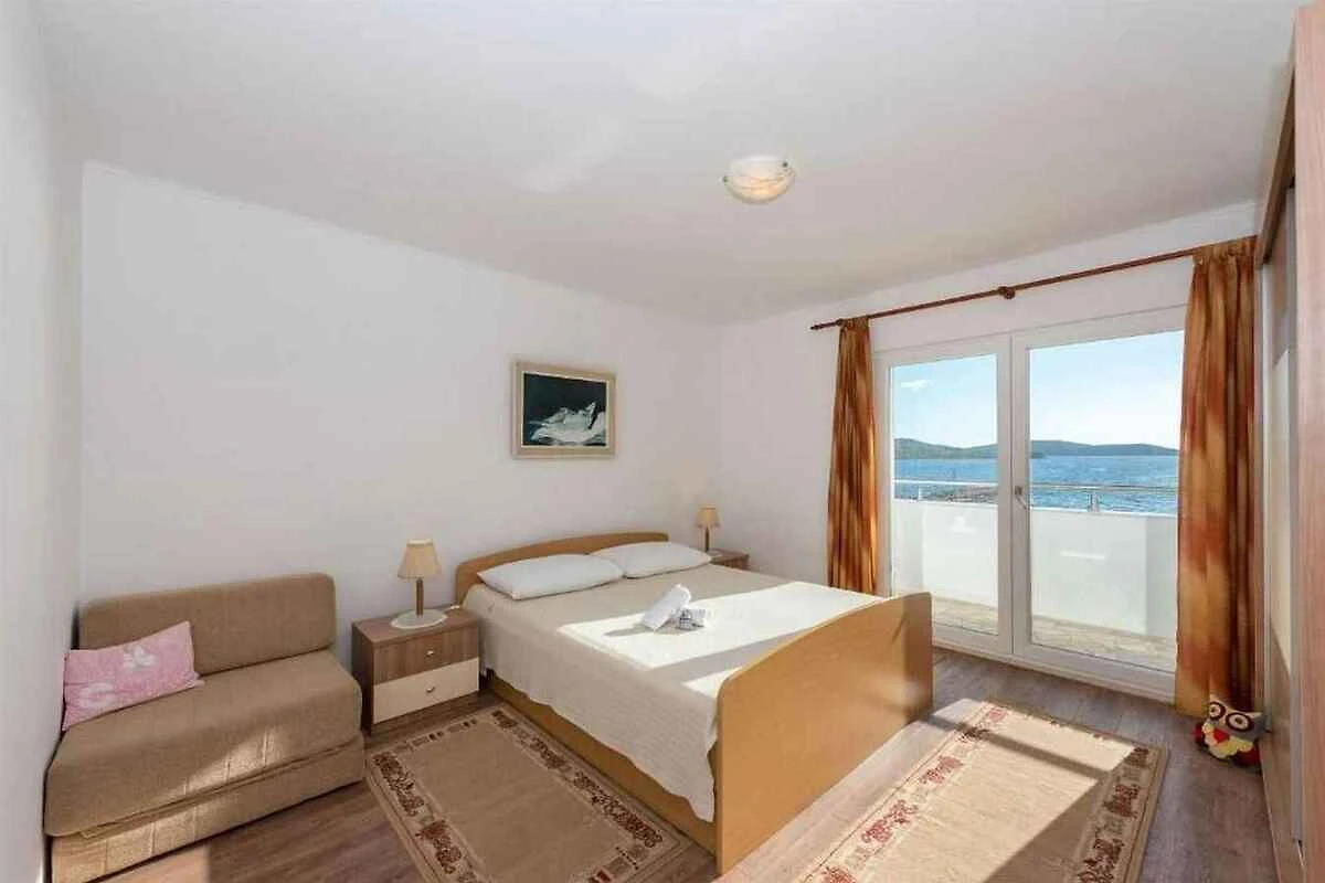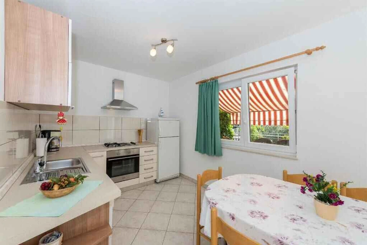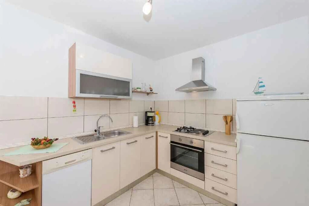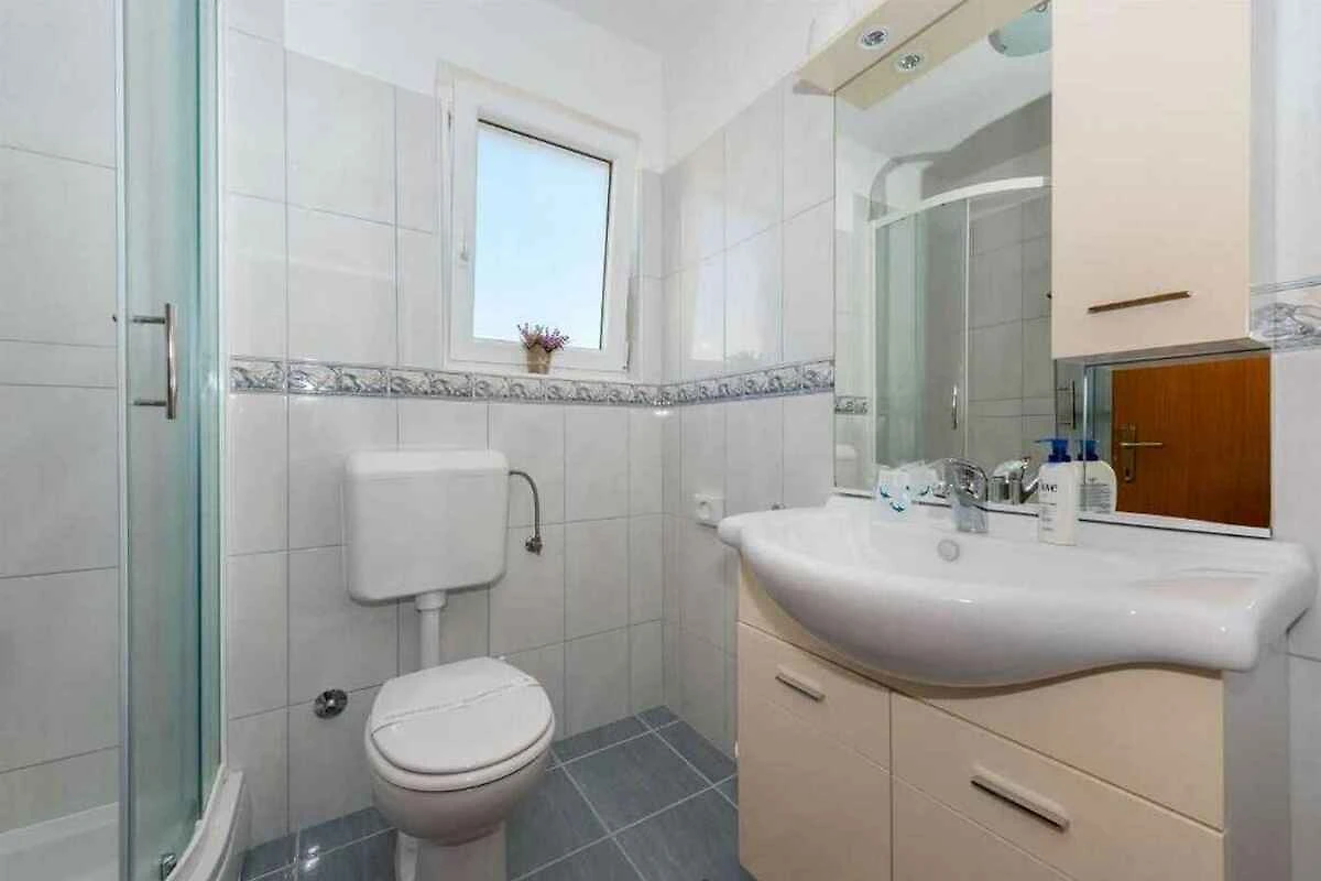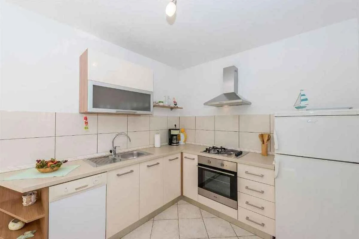 Ligging: Srima. De vakantiewoning ligt in een appartementenhuis en is in lokale stijl ingericht. Deze plaats is populair vanwege het ligt bij het water op een zonnige plek. De toegangsweg naar het terrein gaat via een zijstraat. Bij het huis zijn parkeerplaatsen op het perceel beschikbaar. De dichtsbijzijnde winkels zijn op 150 m afstand, restaurant 100 m en centrum 1000 m. vliegveld in Splitsen 55 km. Srima: dokter, apotheek elk 1200 m. bank 1400 m. discotheek in Vodice 3 km.