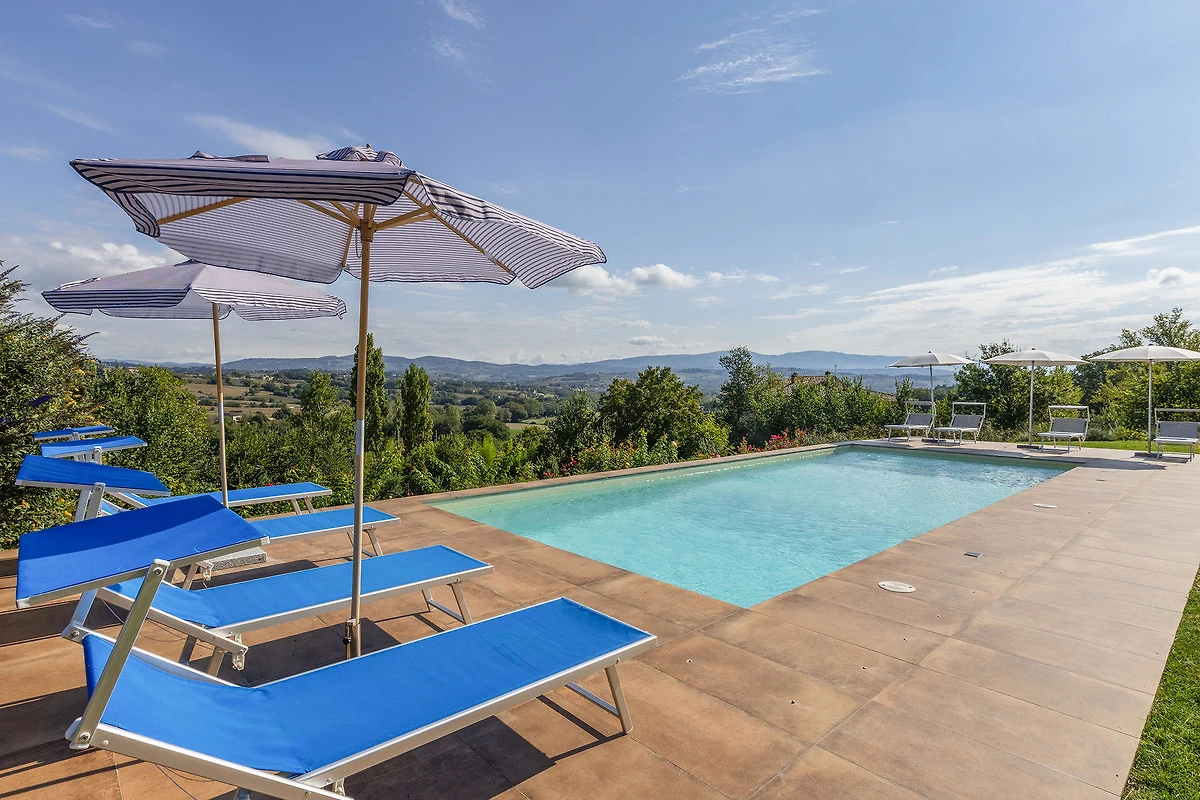 Buiten wacht u een oase van ontspanning: een prachtig zwembad, gezuiverd met zout, biedt een panoramisch uitzicht op de golvende heuvels van Umbrië. Hier kunt u tussen de ligbedden, banken en parasols genieten van momenten van totale ontspanning en volop genieten van de schoonheid van het platteland.