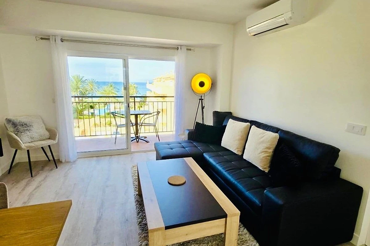 Betreed het privéterras en geniet van een adembenemend uitzicht op het sprankelende gemeenschappelijke zwembad en de zee, ideaal voor een kopje koffie in de ochtend of een drankje bij zonsondergang. Binnen baadt de ruime woonkamer in natuurlijk licht en beschikt over een grote slaapbank, perfect om te loungen of om extra gasten te ontvangen. Airconditioning in zowel de woonkamer als de slaapkamers zorgt voor comfort het hele jaar door.