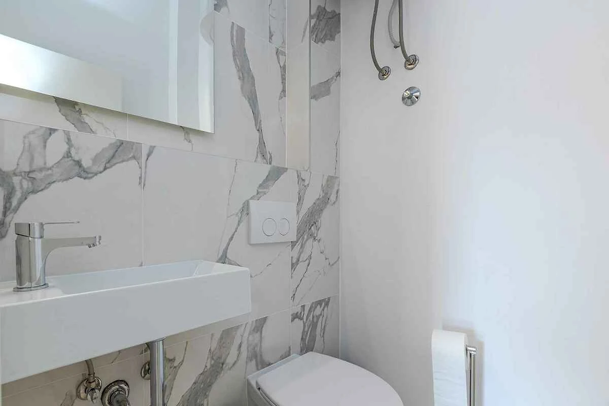 en leidt via een buitentrap direct in de vestibule. De indeling van de kamers is als volgt: woonkamer met zithoek, eethoek en TV. De eethoek heeft plaats voor 4 personen. 2 slaapkamer elk met 1 tweepersoonsbed. U heeft toegang tot het terras met tuinmeubelen, 2 tafels en 8 stoelen. keuken met elektrisch fornuis (4 kookplaat), afzuigkap, koelkast, magnetron, koffiemachine, broodrooster en elektrische waterkoker. badkamer met douche, 1 wastafel, WC, haardroger, venster en wasmachine. aparte WC met 1 wastafel en WC.