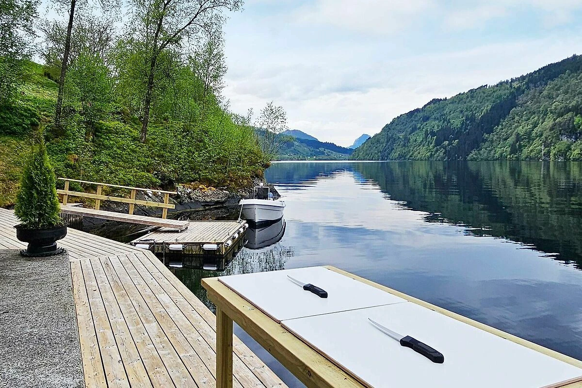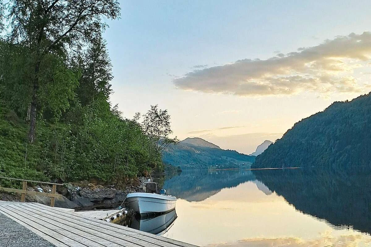 Ansprechendes Ferienhaus direkt am Wasser, mit privatem Steg sowie zwei mietbaren Booten. Die Endreinigung ist hier bereits im Mietpreis inbegriffen! Das Ferienhaus verfügt über ein Wohnzimmer mit Kamin, eine Küche, drei Schlafzimmer und ein Badezimmer. In den Schlafzimmern mit zwei Einzelbetten können diese ggf. zu einem Doppelbett zusammengestellt werden. Das Doppelbett ist ebenso teilbar. Im Wohnzimmer oben im Dachgeschoss befindet sich zudem eine doppelte Schlafcouch (150 x 200 cm). Zur umfassenden Ausstattung des Ferienhauses gehören auch zwei Kühlschränke, wobei sich der eine im Bootsschuppen befindet. Im Haus Smart TV, es können einige deutsche Sender gestreamt werden. Internet mit 75 MB. Draußen auf der großen Terrasse gibt es einen Außenkamin. Bademöglichkeit vom Steg/Badetreppe/Felsen direkt vor dem Ferienhaus. Etwa 8 km mit dem Auto zum nächsten Dorf mit Lebensmittelgeschäft und Restaurant. 5 km zum Lachs- und Forellenfluss Gaula, 40-45 Minuten nach Viksdalsvatnet und Jølstravatnet mit Forellen. HINWEIS: Für das Angeln im Süßwasser/in Flüssen ist der Erwerb eines Angelscheins erforderlich. Die Entfernung zum Boot beträgt ca. 5 m. Möglichkeiten für tolle Tagesausflüge in einer Entfernung von 2-3 Autostunden vom Ferienhaus, z.B. nach Geiranger, Nærøyfjorden oder Briksdalsbreen. Markierte Wanderwege in den Bergen. Etwa 15 Minuten Fahrzeit per Boot erreicht man vom Ferienhaus aus Laukelandsfossen; ein beeindruckender Wasserfall mit einer Fallhöhe von 135 Metern und einer Breite von bis zu 100 Metern bei hohem Wasserdurchfluss. Überdachte und überdachte Filetierbank mit Licht und fließend Wasser im Keller des Bootshauses. Boote zu mieten: *zwei 20 Fuß Boote (Typ Vest 590F) mit 60 PS Yamaha bzw. 50 PS Suzuki Motor. Zudem zwei SUP-Boards inklusive.