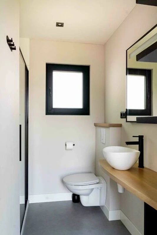 - Badkamer met douche, toilet en wastafel met spiegel.