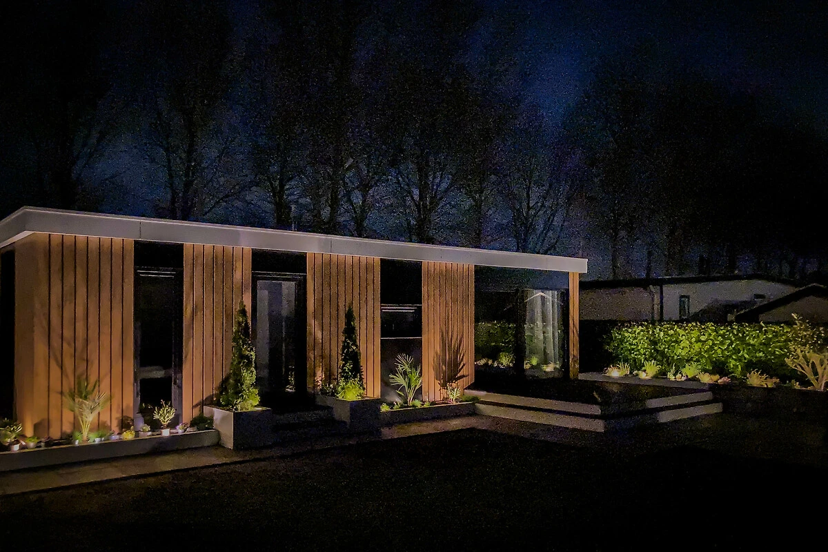 - Tuin voorzien van groot terras, tuinmeubelen, loungebank, Houtskool Weber BBQ, sfeerverlichting in de avond en groot vlonder direct aan de living.