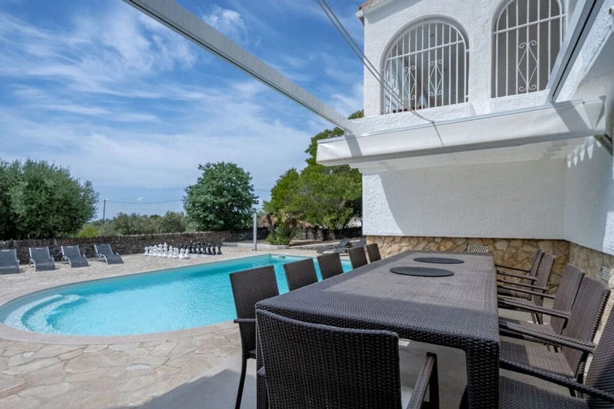 Fantastische woning met een groot zwembad - ideaal voor 1 groot gezin of 2 gezinnen Privézwembad, tafeltennis, darts enz. zorgen voor plezier voor het hele gezin Overdekte chill-outzone met uitzicht op zee Buitenbanken Barbecue Overdekte eethoek bij het zwembad