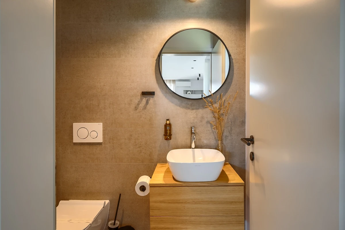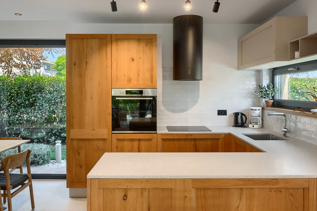 De open keuken, met inductie kookplaat, is uitgerust met koelkast, magnetron, oven, vriezer, vaatwasmachine, servies/bestek, keukengerei, koffiezetapparaat, broodrooster en waterkoker.