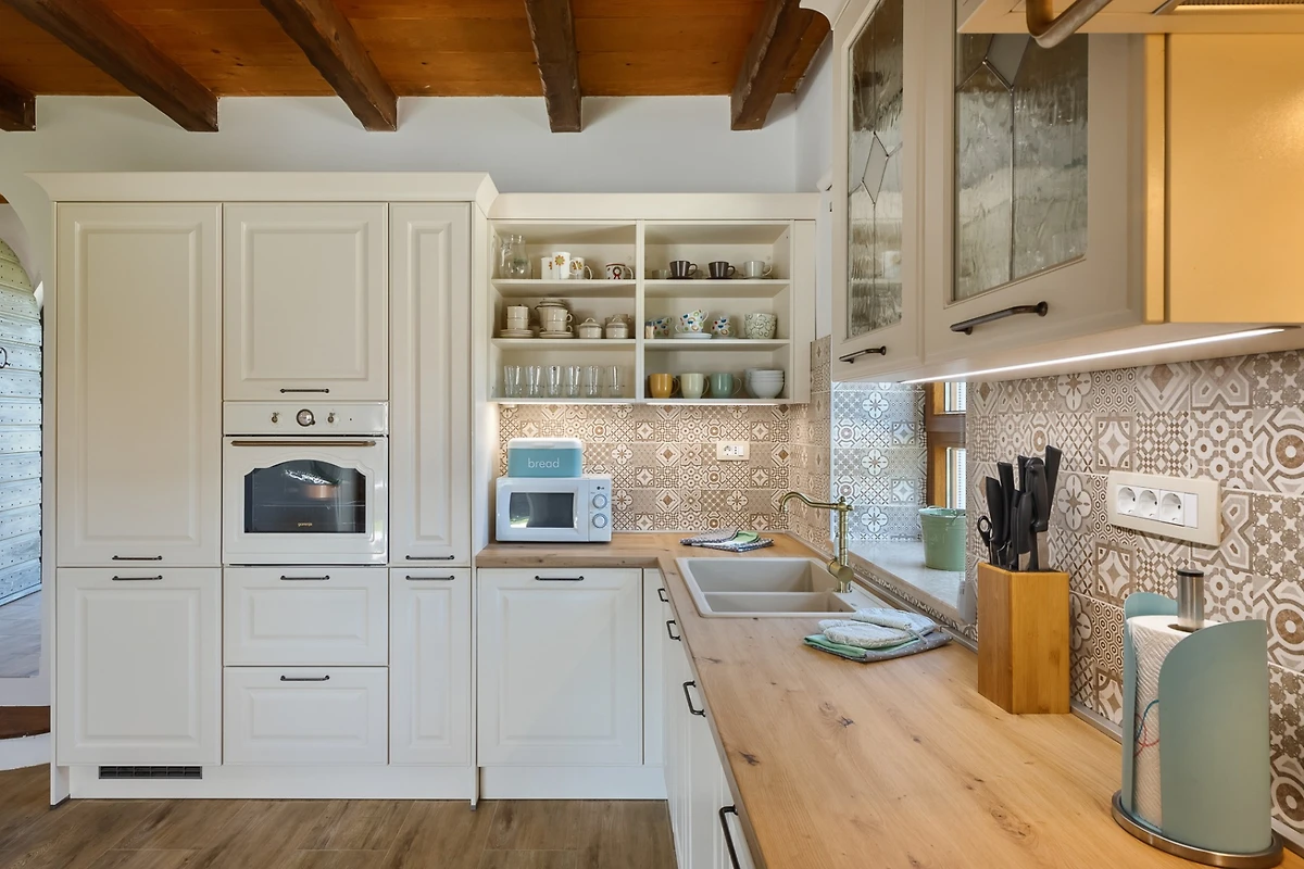 De open keuken, met gasfornuis, is uitgerust met koelkast, magnetron, oven, vriezer, vaatwasmachine, servies/bestek, keukengerei, koffiezetapparaat, broodrooster en waterkoker.