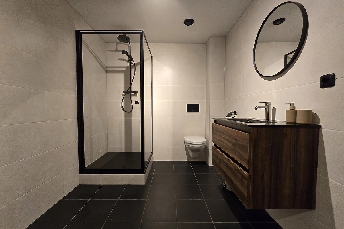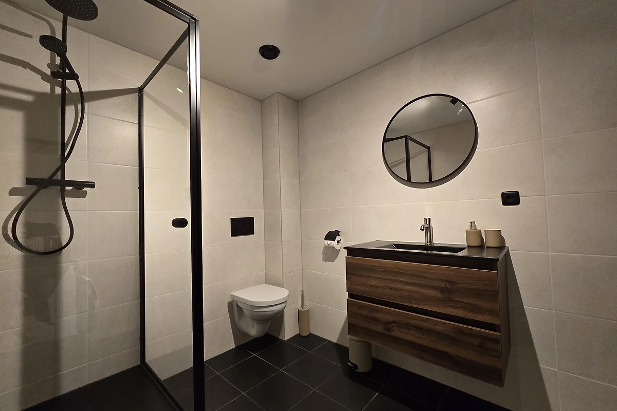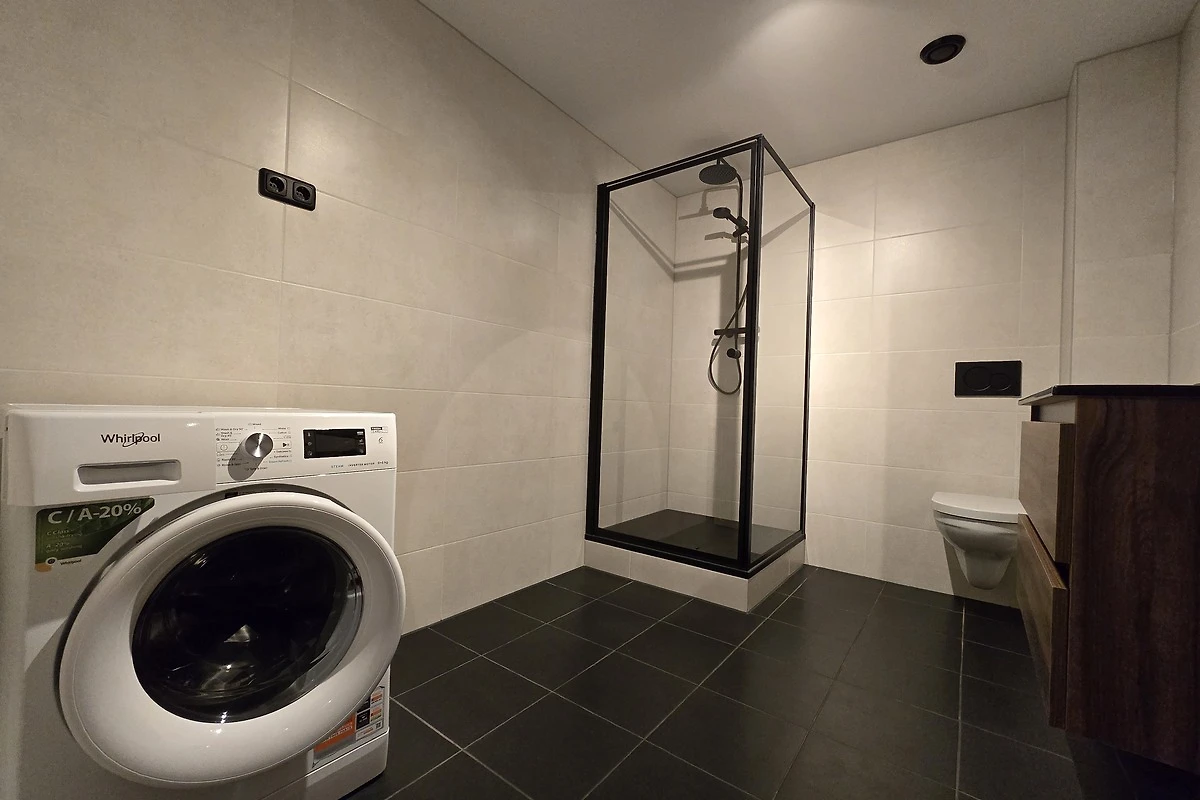 Naast de woonkamer bevindt zich de badkamer met douche, bad, toilet, wastafel met spiegel en wasmachine.
