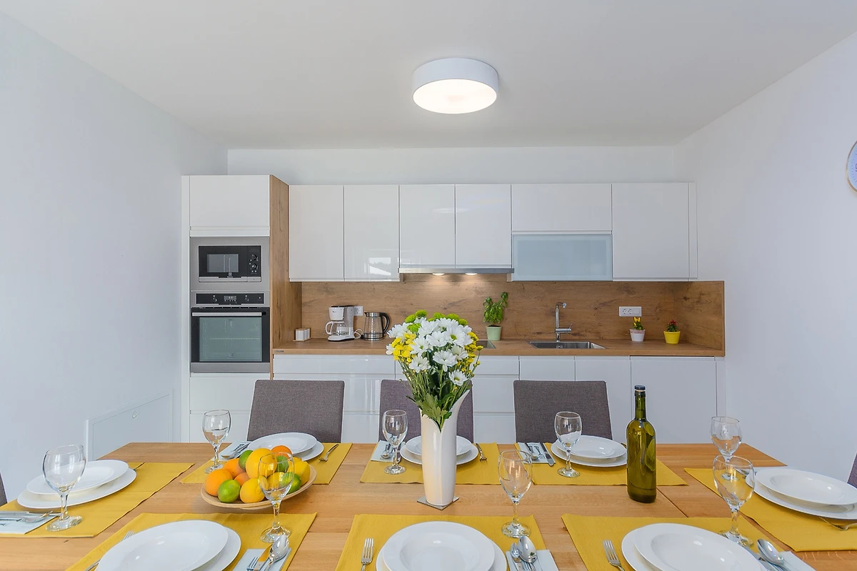 De open keuken, met inductie kookplaat, is uitgerust met koelkast, magnetron, oven, vriezer, vaatwasmachine, servies/bestek, keukengerei, koffiezetapparaat, broodrooster en waterkoker.