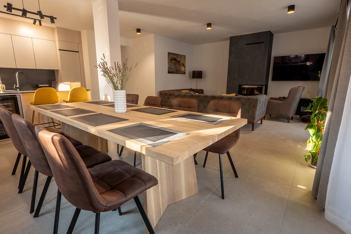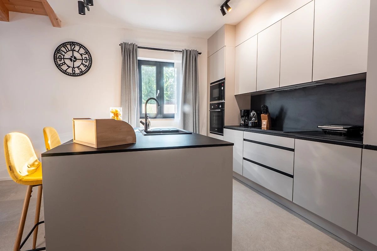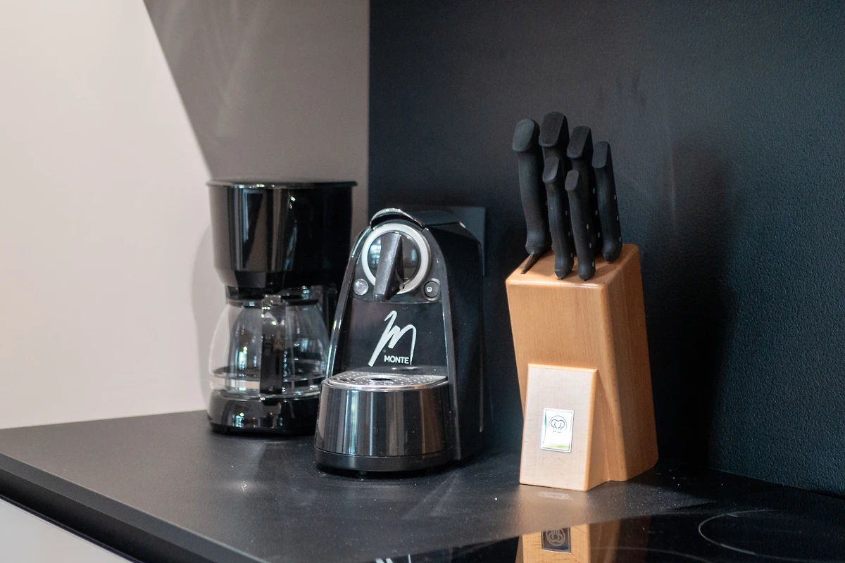 De open keuken, met inductie kookplaat, is uitgerust met koelkast, magnetron, oven, vriezer, vaatwasmachine, servies/bestek, keukengerei, koffiezetapparaat, broodrooster en waterkoker.