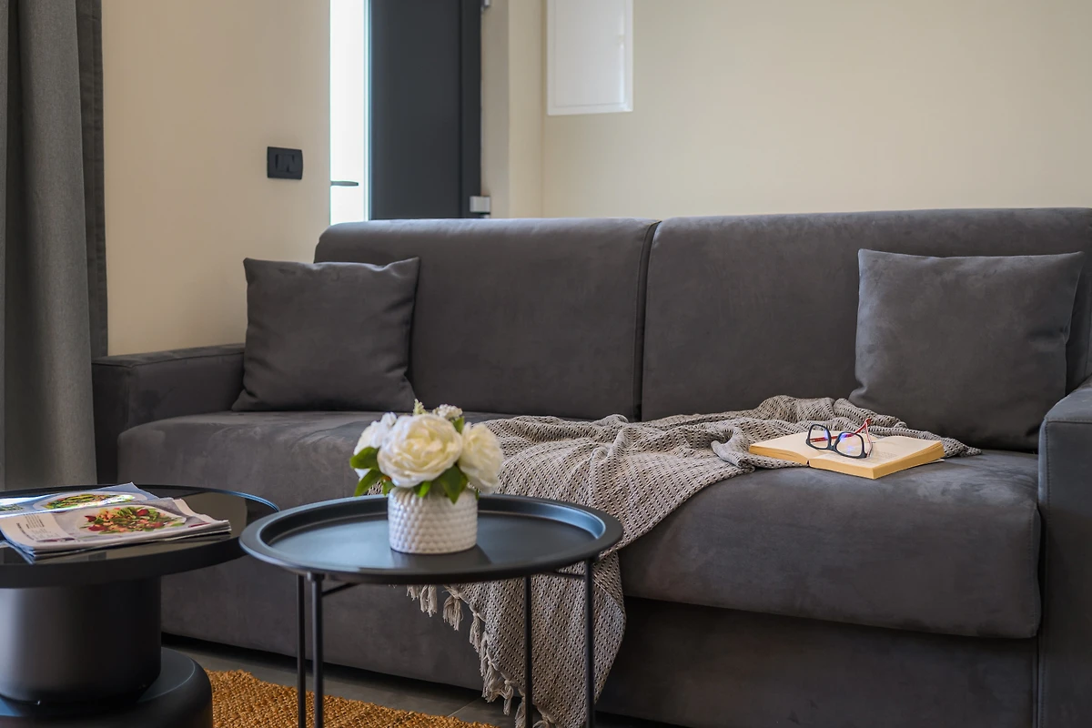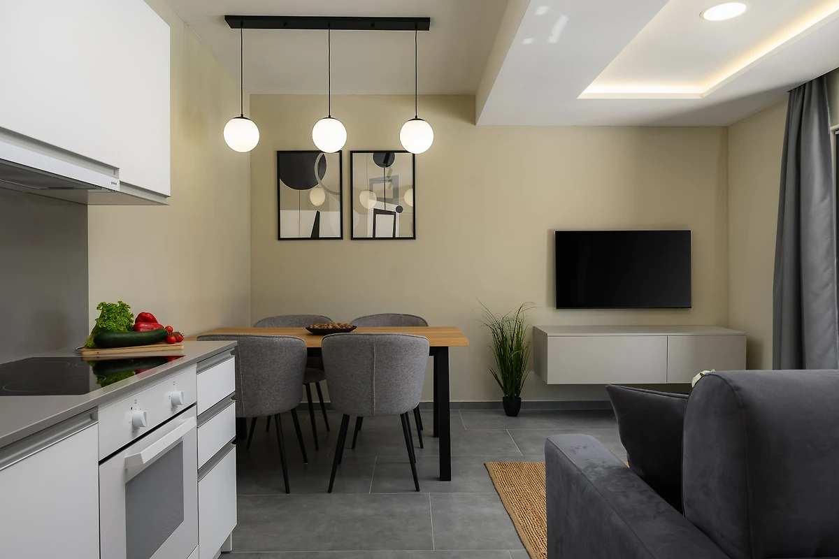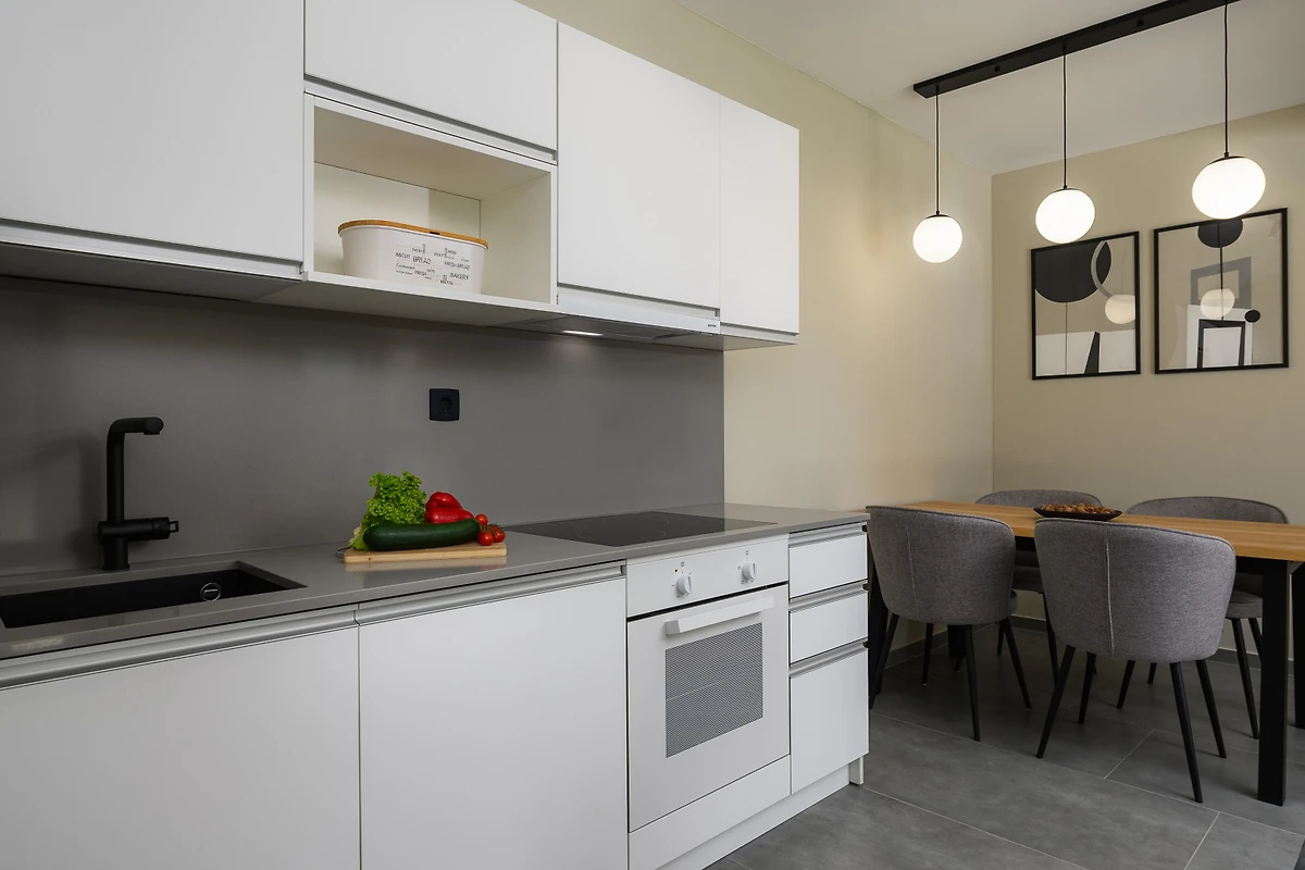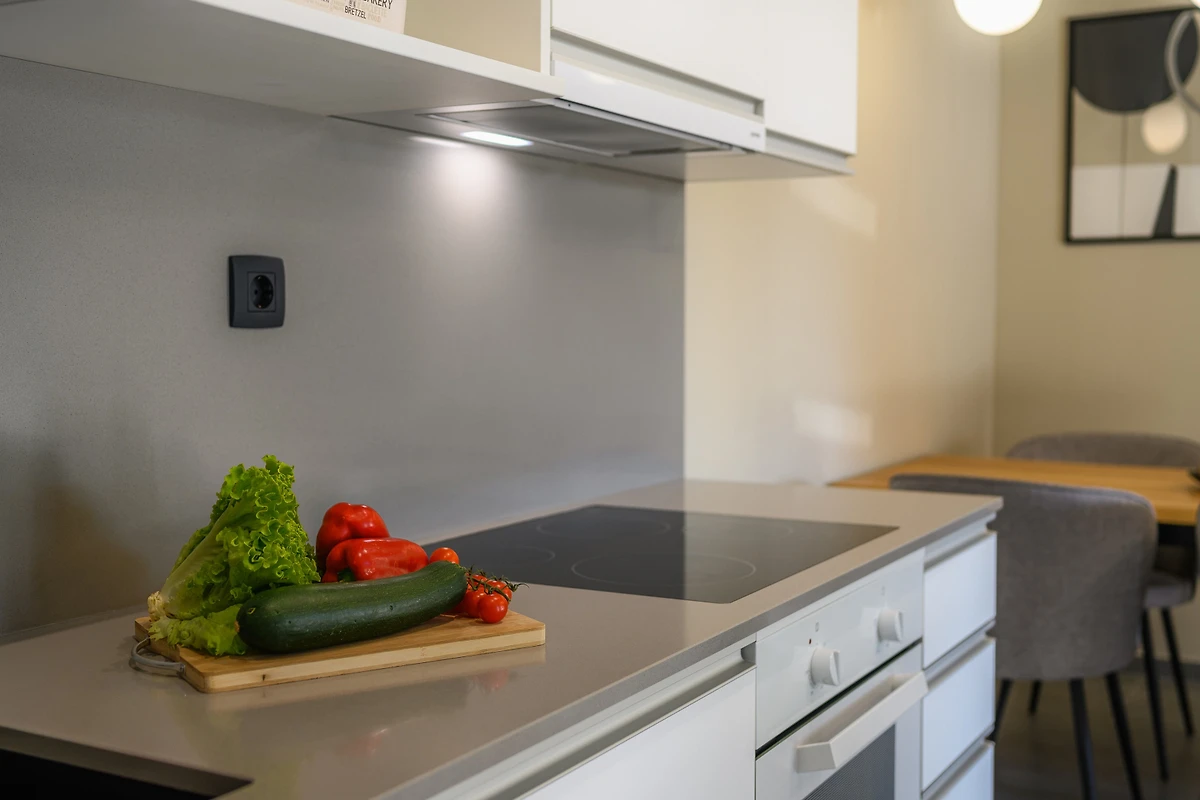De open keuken, met inductie kookplaat, is uitgerust met koelkast, oven, vriezer, vaatwasmachine, servies/bestek, keukengerei, koffiezetapparaat, broodrooster en waterkoker.