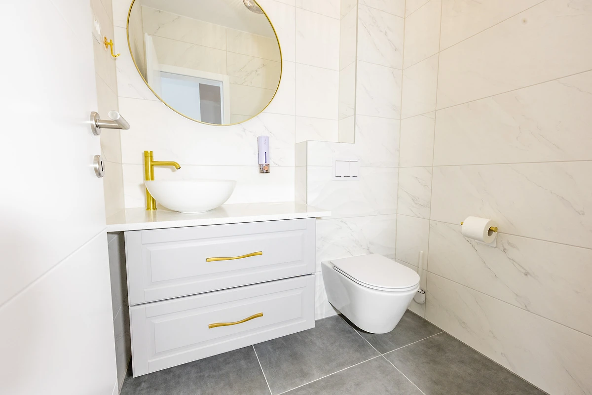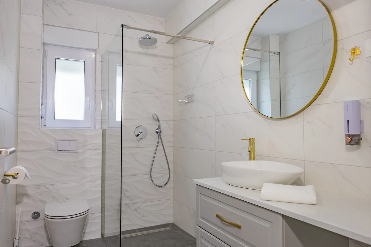 De badkamers zijn modern ingericht en beschikken over een wasmachine en een haardroger.