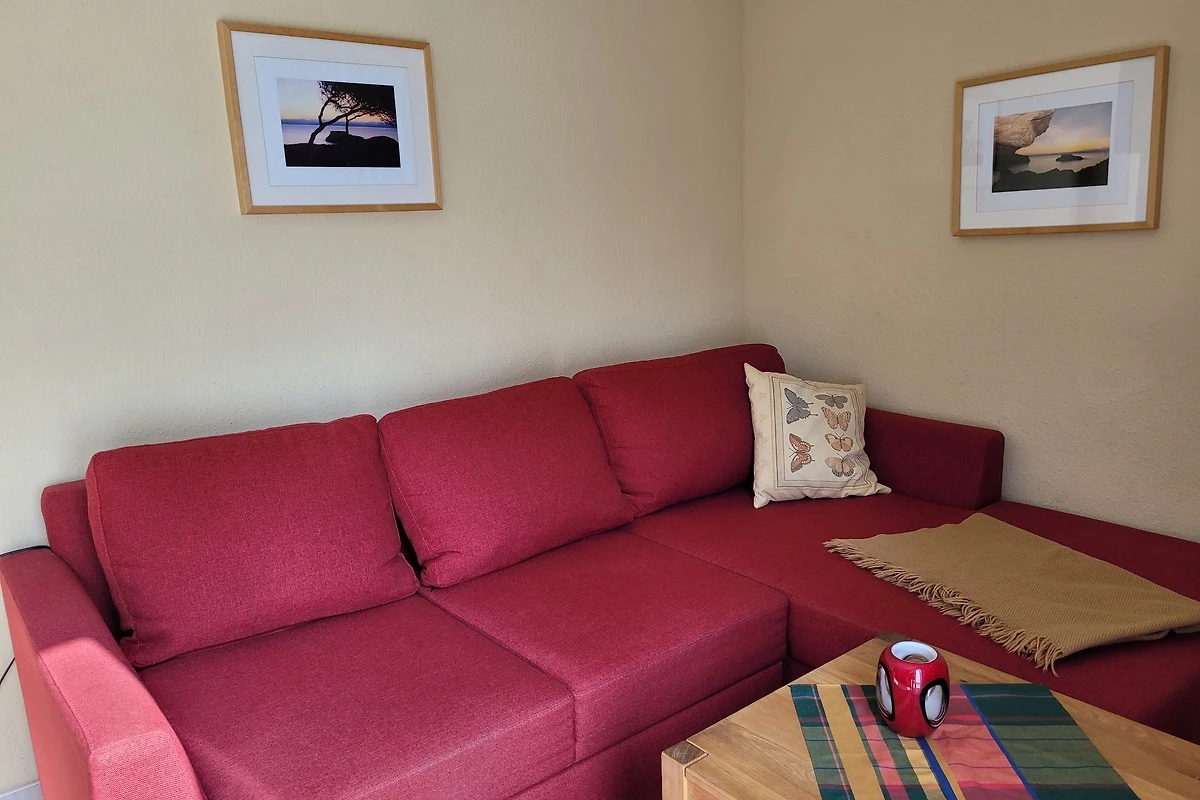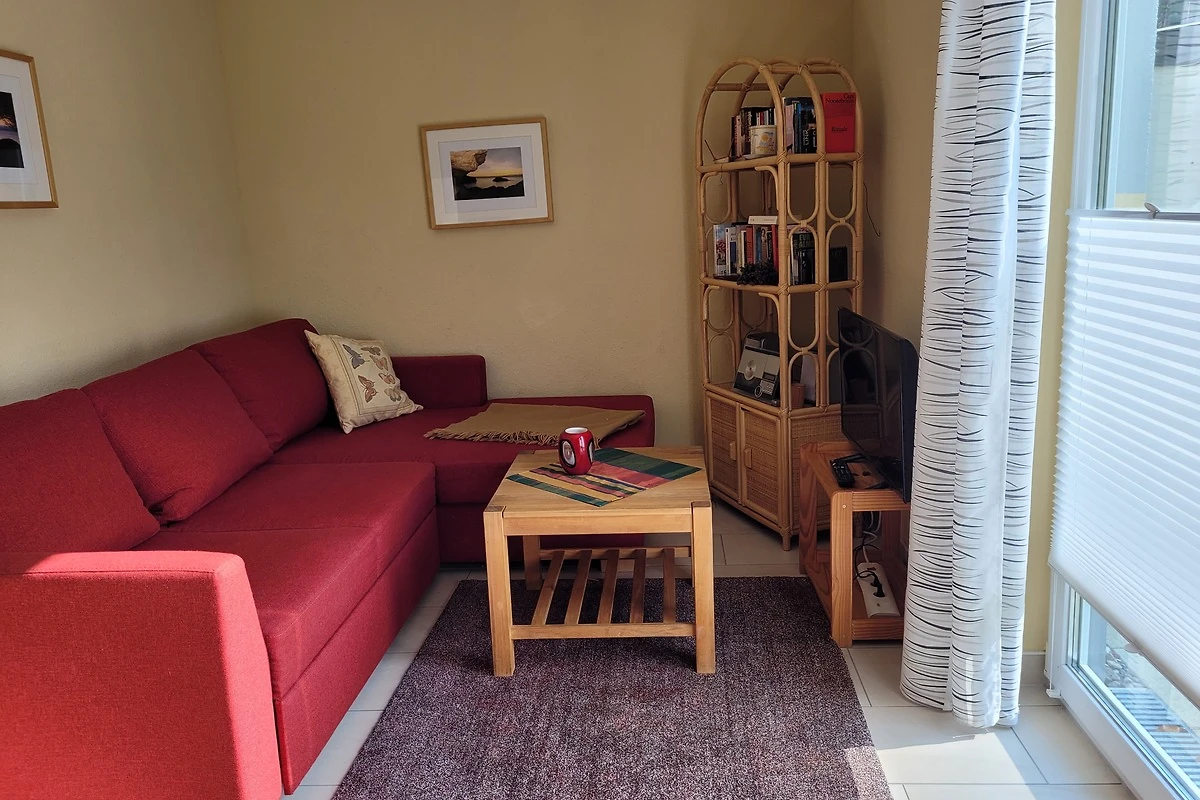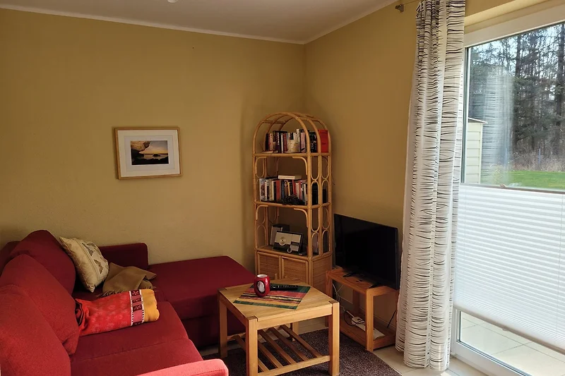 Het appartement valt op door zijn moderne interieur en het gebruik van hoogwaardige houtmaterialen, die een warme en uitnodigende sfeer creëren. De open woonruimte is uitgerust met een comfortabele sofa, een flatscreen-tv en een selectie van boeken - perfect voor ontspannen avonden na een dag op het strand. De grote ramen laten veel natuurlijk licht binnen en bieden een mooi uitzicht op de tuin.