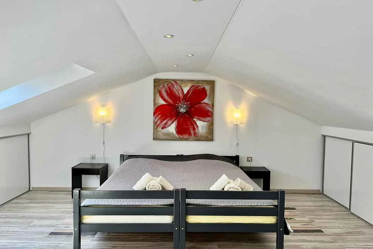 2.verdieping: slaapkamer met 1 tweepersoonsbed en 1 extra bed op slaapbank.