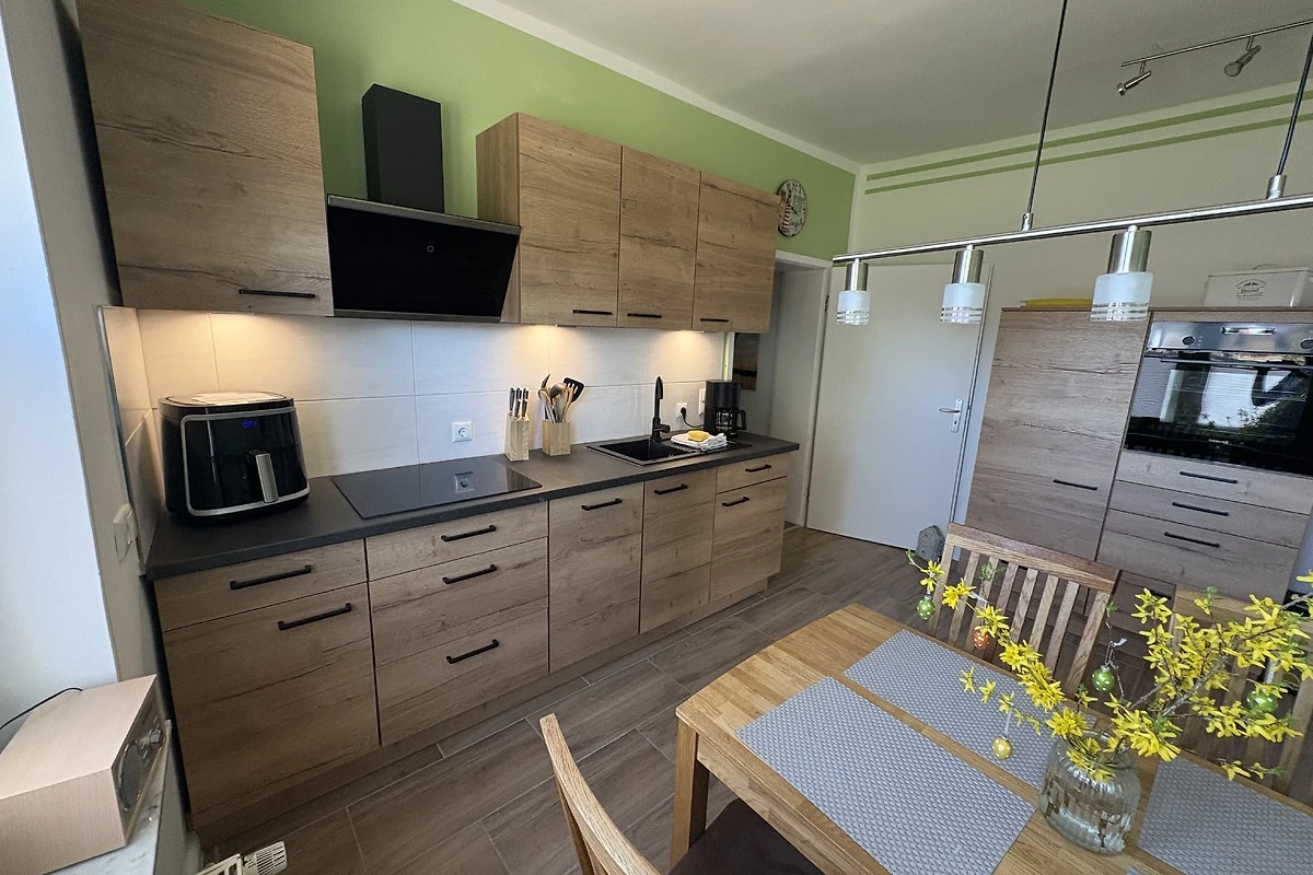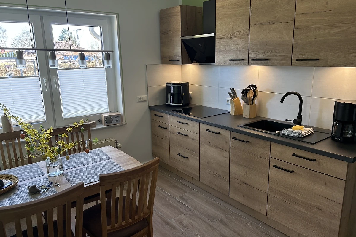 In april 26 gloednieuwe Nobilia-keuken! Het appartement beschikt over een volledig uitgeruste kitchenette met vaatwasser, heteluchtfriteuse, waterkoker en koffiezetapparaat. Hier kunt u uw maaltijden bereiden en genieten, terwijl u het prachtige uitzicht op het omliggende landschap bewondert. Het natuurlijke strand aan de Greifswalder Bodden ligt op slechts 400 m afstand en is te voet bereikbaar.