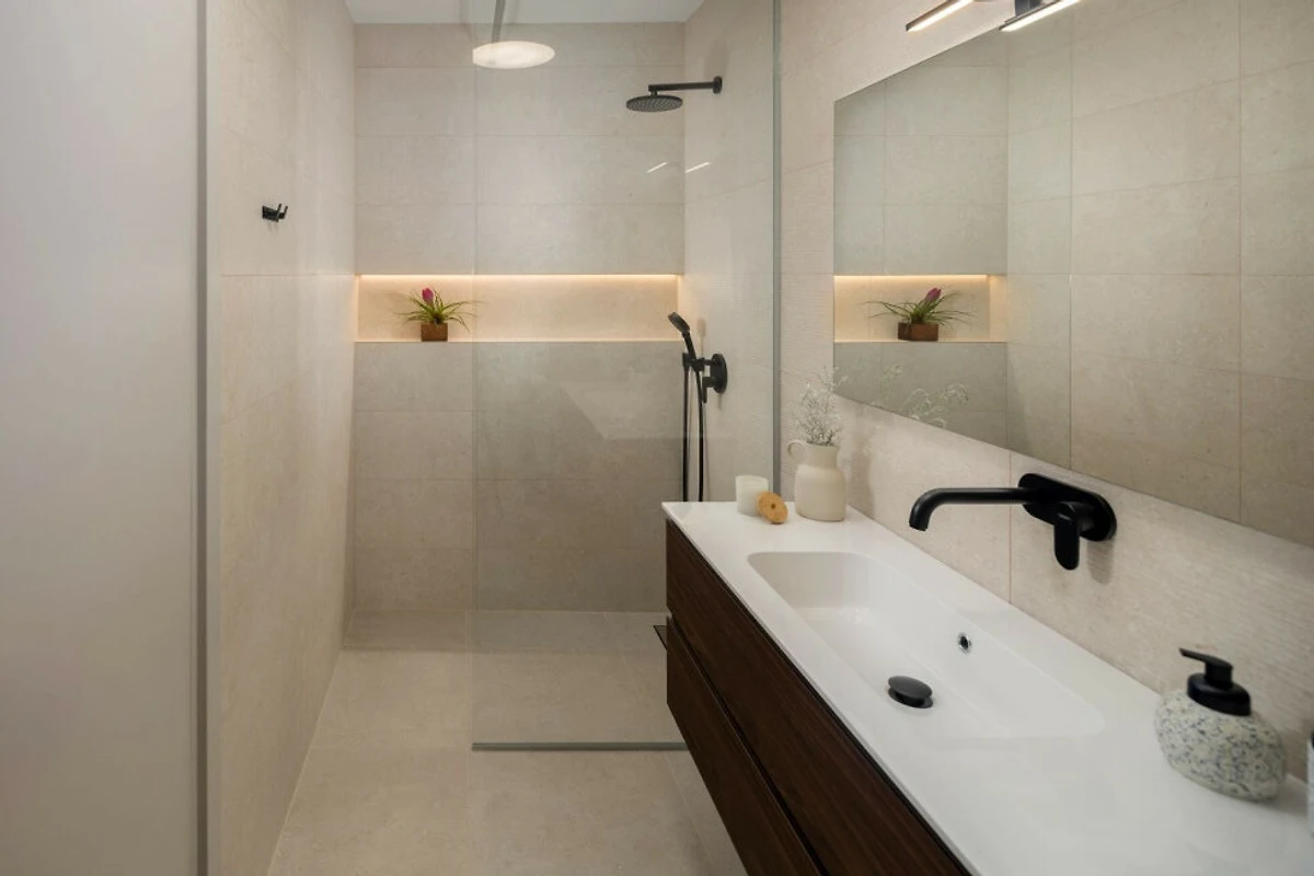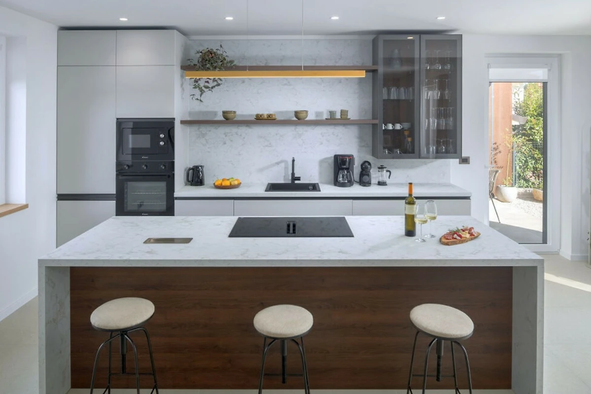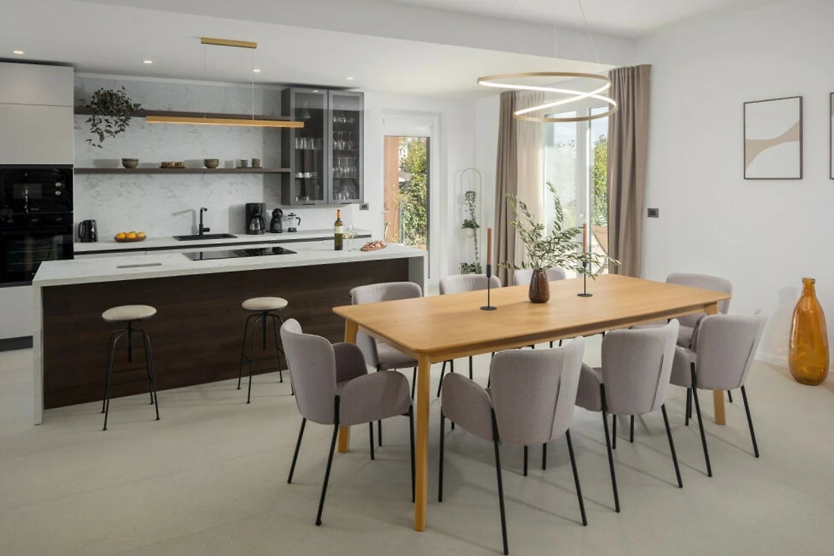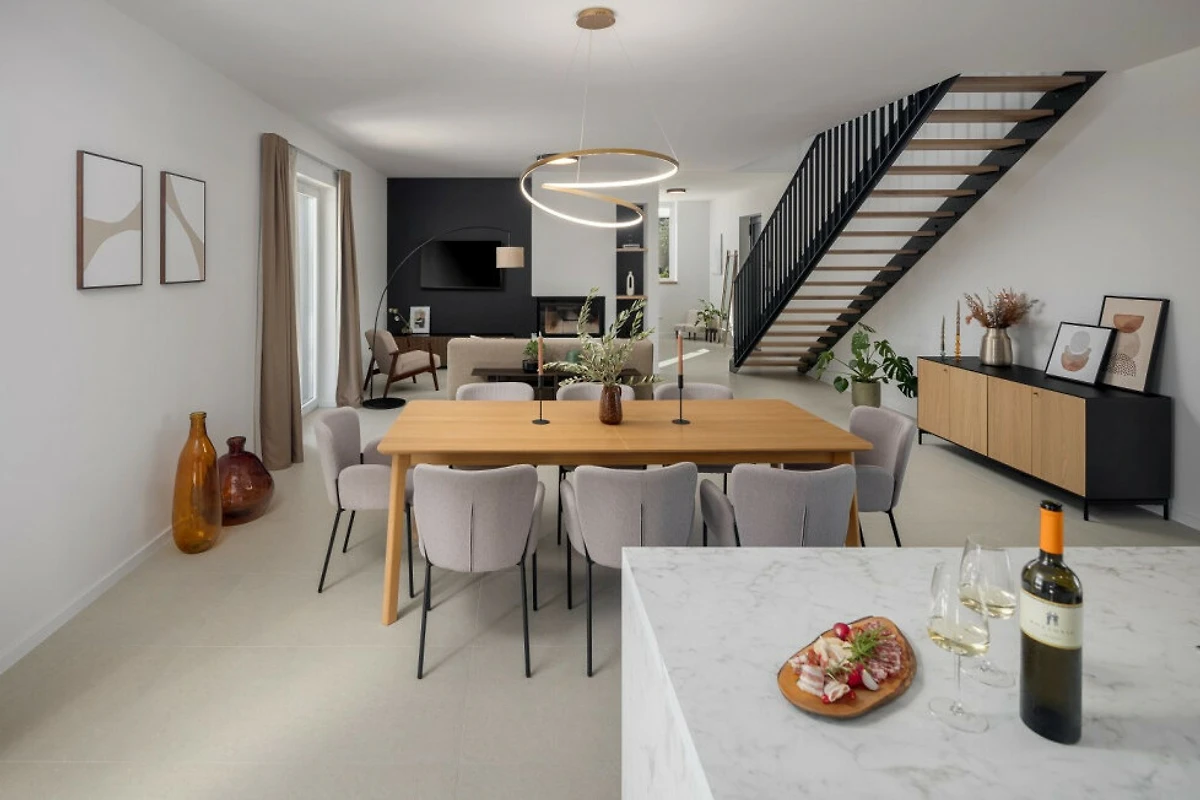 De open keuken, met inductie kookplaat, is uitgerust met koelkast, magnetron, oven, vriezer, vaatwasmachine, servies/bestek, keukengerei, koffiezetapparaat en waterkoker.