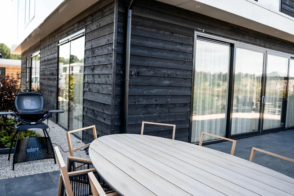 aanlegsteiger(buitenom bereikbaar, via buitentrap), eettafel, terras(privé), tuin(deels omheind), tuinmeubilair, BBQ(elektrisch), parking, tennisbaan(gedeeld met andere gasten, tegen betaling), zonne energie, lucht-water warmtepomp