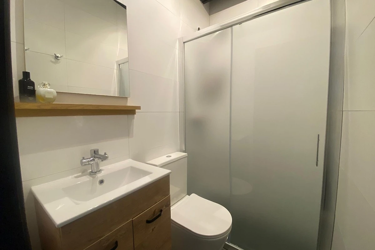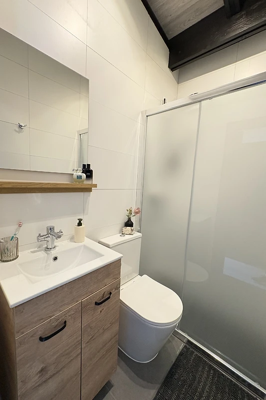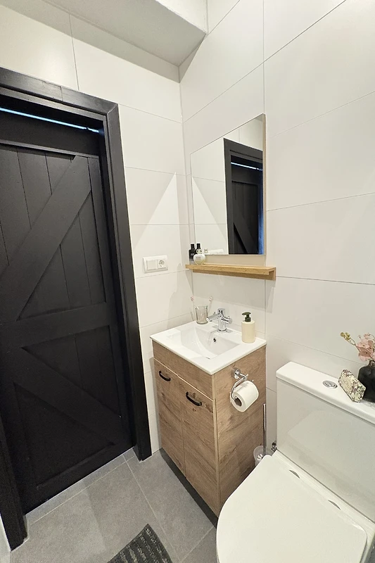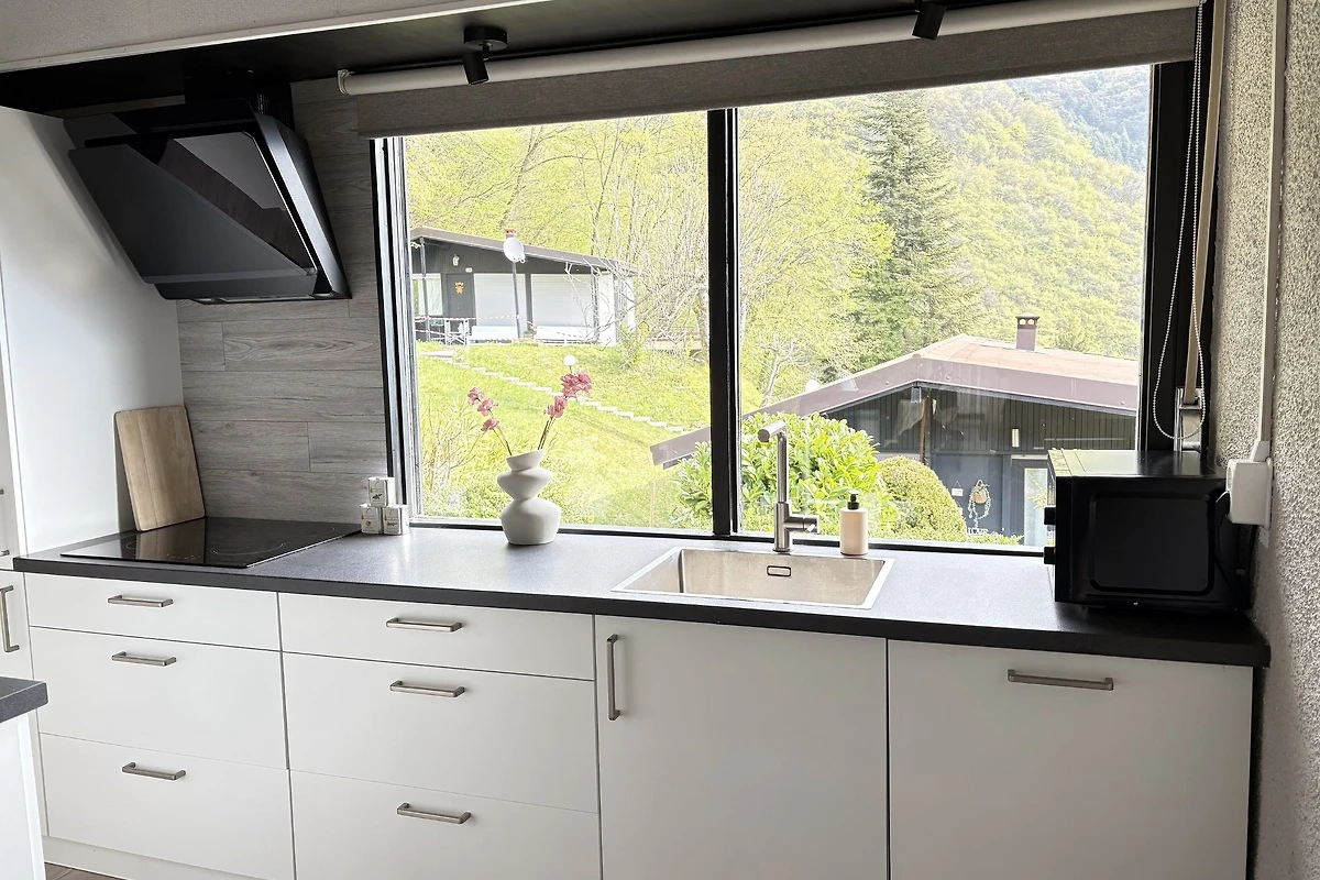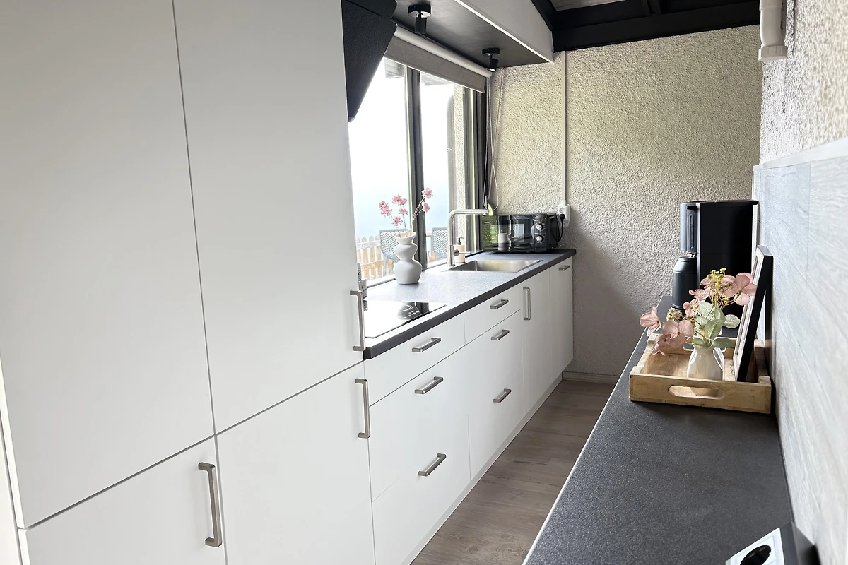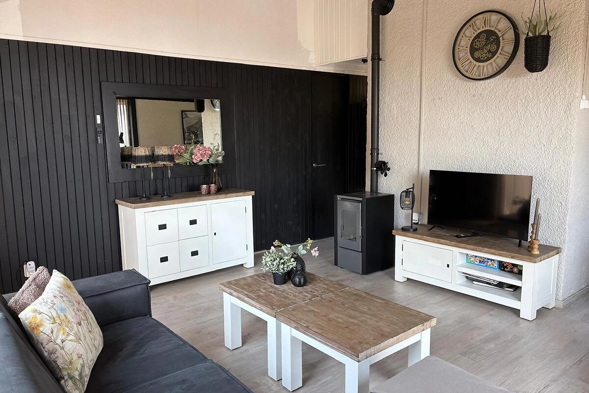 Binnen vindt u een moderne, volledig uitgeruste keuken met vaatwasser, inductiekookplaat, magnetron, waterkoker en koffiezetapparaat. De gezellige woonkamer is ingericht met een comfortabele bank en tv – ideaal voor ontspannen avonden. Uiteraard is er gratis wifi in de gehele woning.