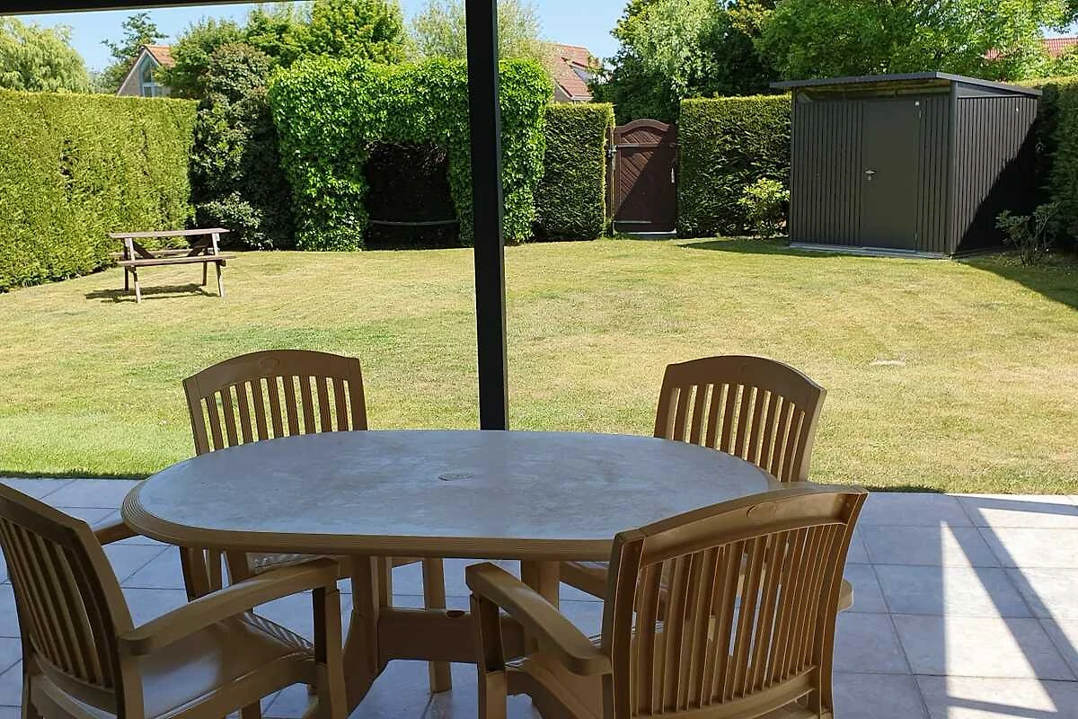 Kom en geniet van de half open veranda met zicht op de afgesloten tuin waar u kan genieten van de dieren en kinderen die naar hartenlust stoeien op het gazon .