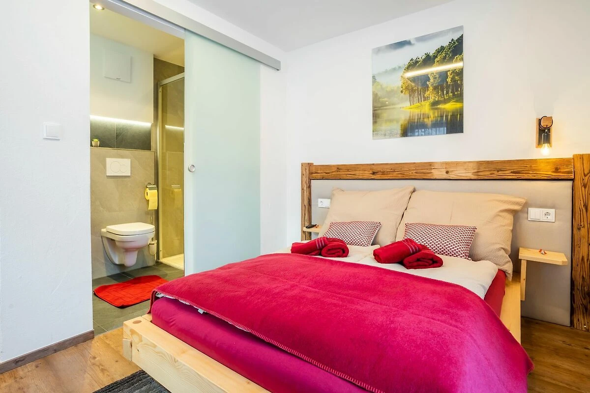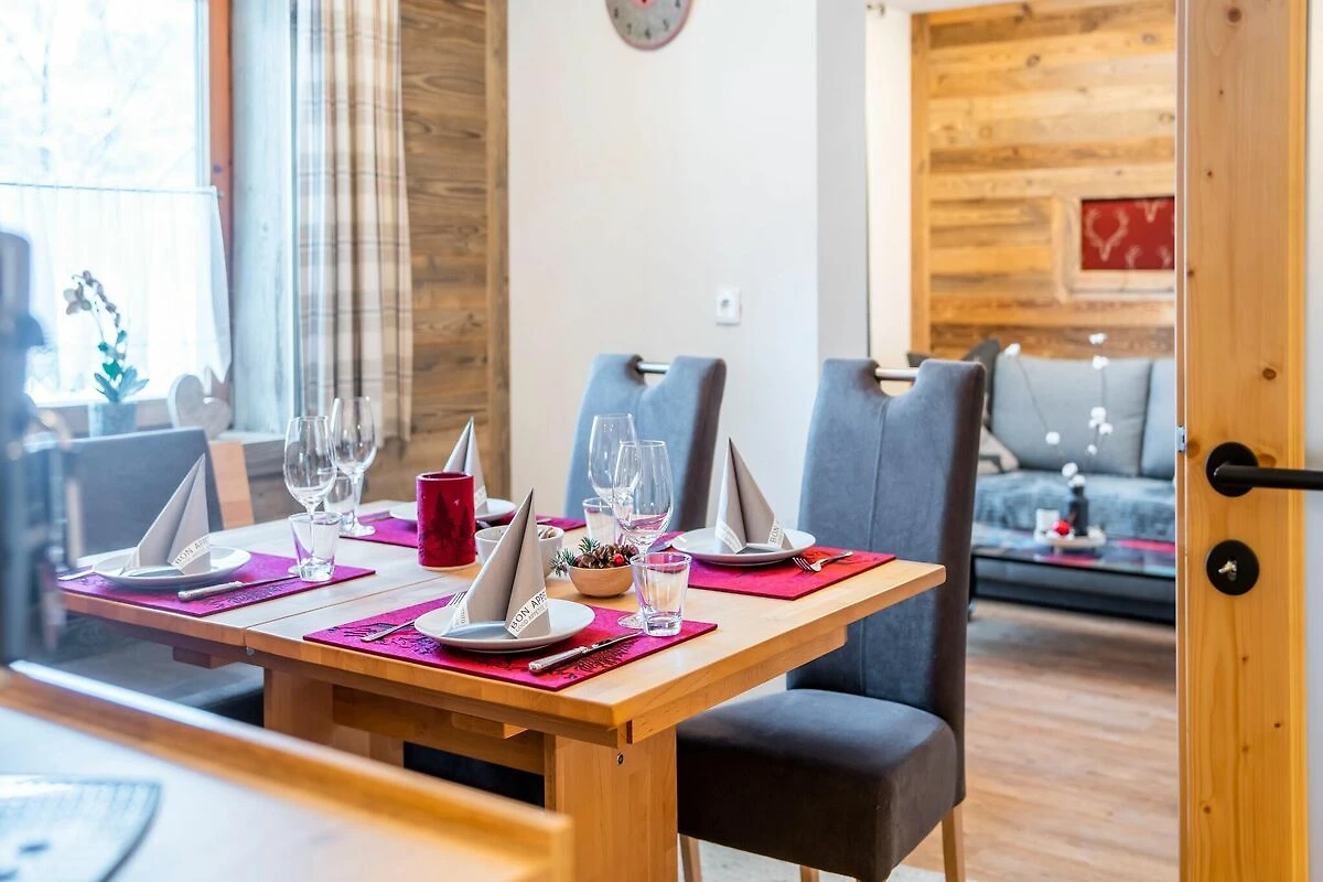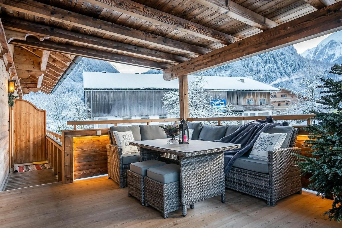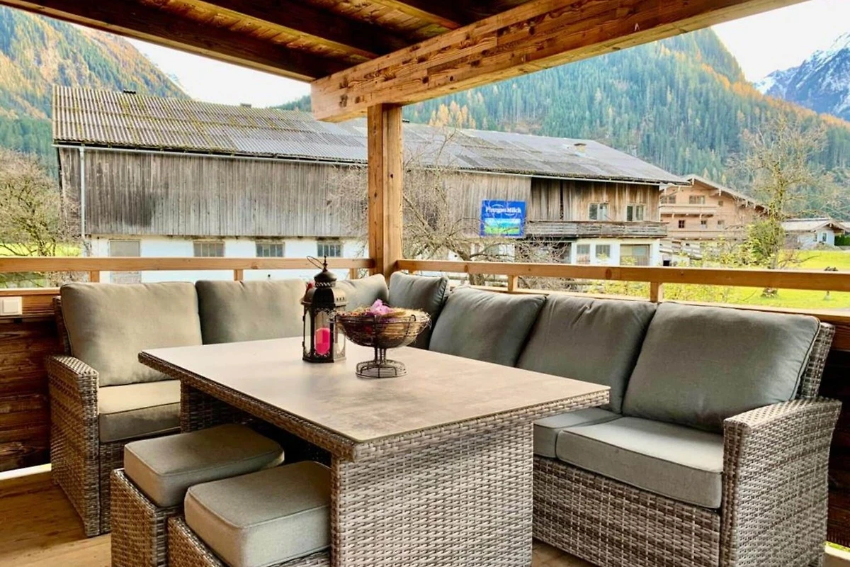 Een bijzonder hoogtepunt van één appartement is het bubbelbad op het terras, van waaruit je kunt genieten van een adembenemend uitzicht op de majestueuze bergen van de regio. Dit biedt de perfecte gelegenheid om te ontspannen na een actieve dag in de bergen en de omringende natuur te bewonderen. De overdekte tuinsalon nodigt je uit om gezellige uurtjes door te brengen, of je nu samen dineert of gewoon blijft hangen en geniet van de frisse berglucht.